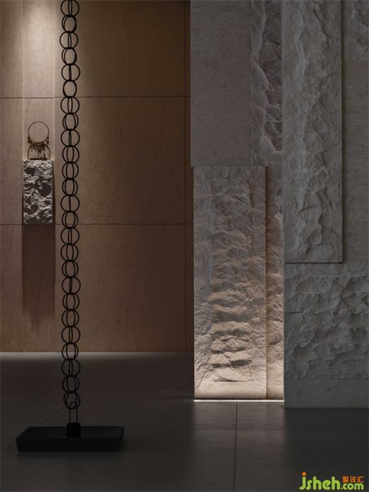 步入建筑之初,映入眼帘的便是一叶漂浮于湖面的扁舟。深色镜面拟造“静”态下的湖面,叠石青竹相映成趣,展现出一幅恬静宜人的画卷。将清新自然的景致引入室内空间,缔造充满东方审美意蕴的艺术氛围。