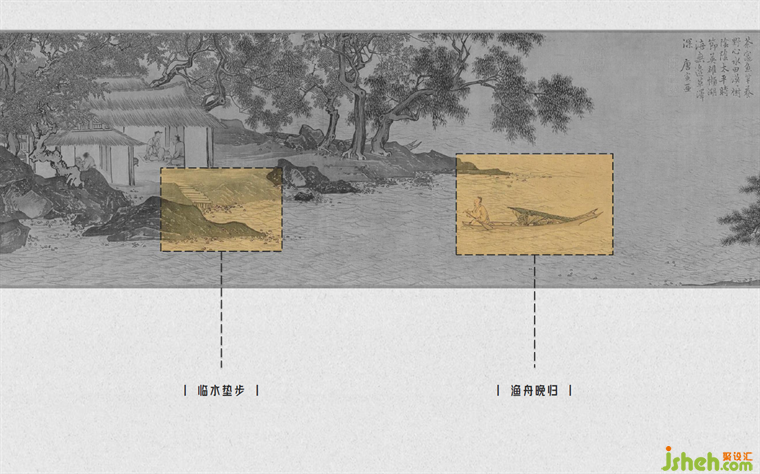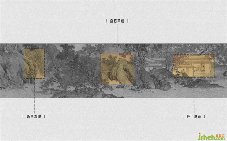 本案销售中心设计灵感源自唐代著名画家唐寅晚年的作品《溪山渔隐图》。此画描绘了唐寅在经历世间纷扰后,回到姑苏城后,对悠静自然生活的向往和追求。这与此次项目的定位相契合——创造一个身处繁华世界中,却能保持内心平静的精神港湾。“入则静谧,出则繁华”,我们以此为理念,通过深入挖掘画中的每个细节,构建不同功能空间的设计方案。