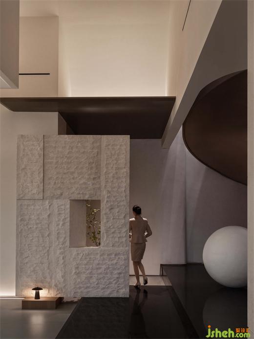 空间布局兼顾了艺术馆式的自由和开放,不仅满足了功能性的需求,更将艺术与建筑融为一体。蜿蜒而上的艺术阶梯,如同一条丝带,销售中心设计将空间与建筑紧密地连接在一起,增强了空间的连续性和流动性,为整个室内注入了无尽的活力。
