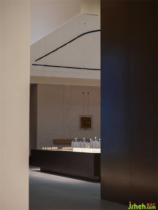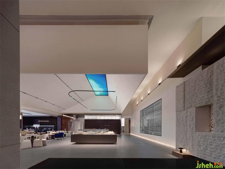 沙盘区顶部采用茅屋的梯形结构,模拟镂空效果,体现出传统建筑的美学特点,让空间结构看起来更加轻盈和自由。销售中心设计垂落的灯带丰富空间的层次感,不再局限于传统售楼处的展示模式,而是以一种更为灵活且富有创意的方式呈现。
