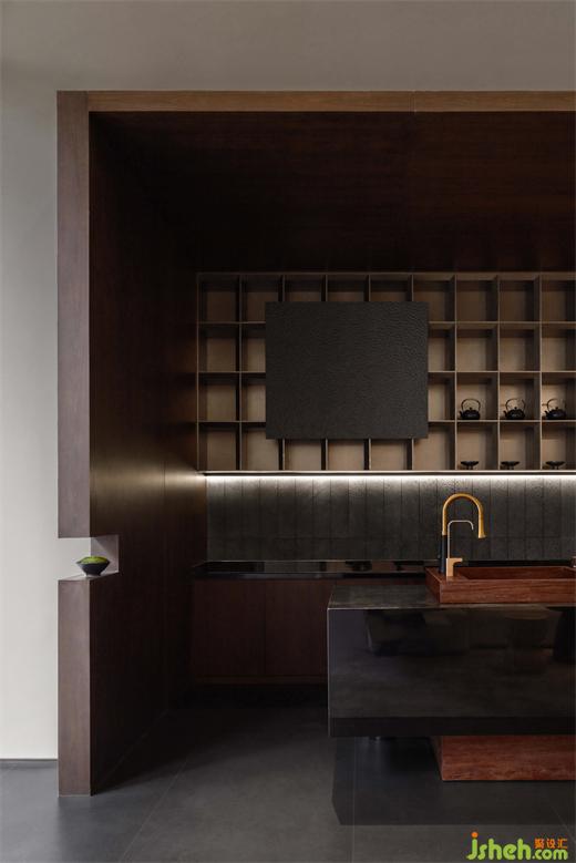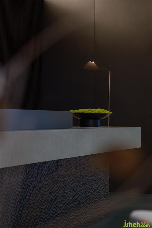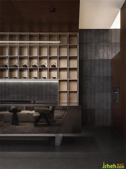 水吧台处,茶道与品茗文化弥漫其中,营造“竹下忘言对紫茶,全胜羽客醉流霞”的风雅氛围,构建出以姑苏在地文化为基础的独特场域,融入现代审美观念,使整个空间弥漫着东方韵味。深沉色调的水吧台搭配井字格陈列柜,在满足功能性的同时,也为人们营造了一个品味生活、体验艺术的空间。