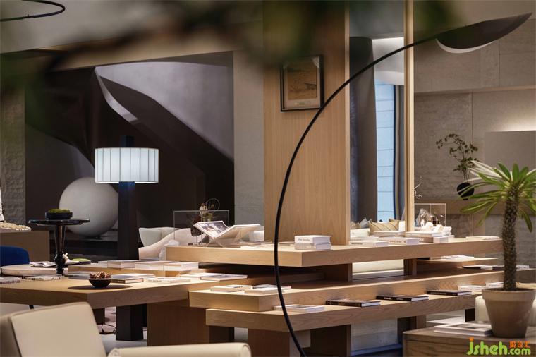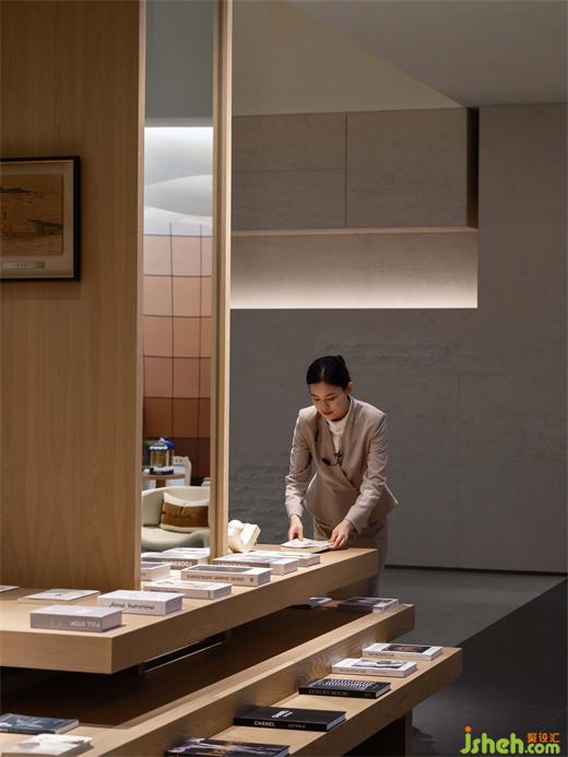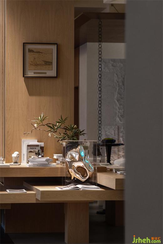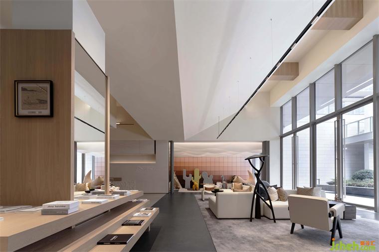 在边界处外露部分建筑梁体,保留梁的原始质感和体块感,增强空间的艺术性。参差错落的板块构成了人文艺术与水墨书卷的展示区,销售中心设计将传承的国学与现代艺术相结合,在洽谈区演绎出一种别样的文化韵味。