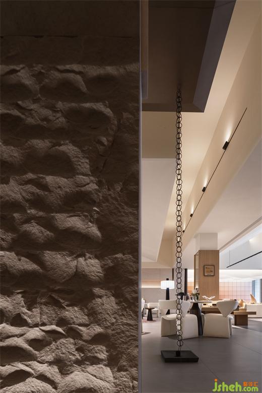 柔软舒适的皮质沙发,伴随着悠扬的音乐,让人感受到一种惬意的生活节奏。一侧的艺术装置采用质感鲜明的岩石板,自然舒展的纹理,仿佛在诉说着岁月的沧桑和空间的无限宽广。