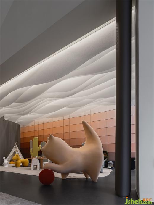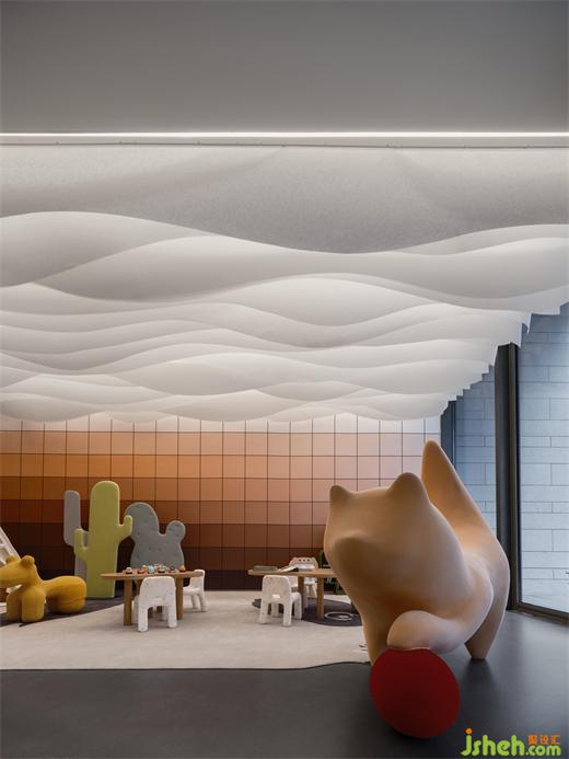 鲜明的色彩与柔软的曲线是儿童娱乐区的特点,轻巧可爱的动物装饰与玩偶构建了一片属于孩子们的游乐园。