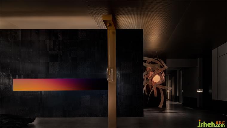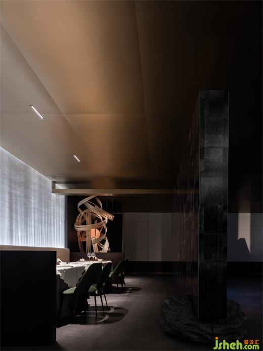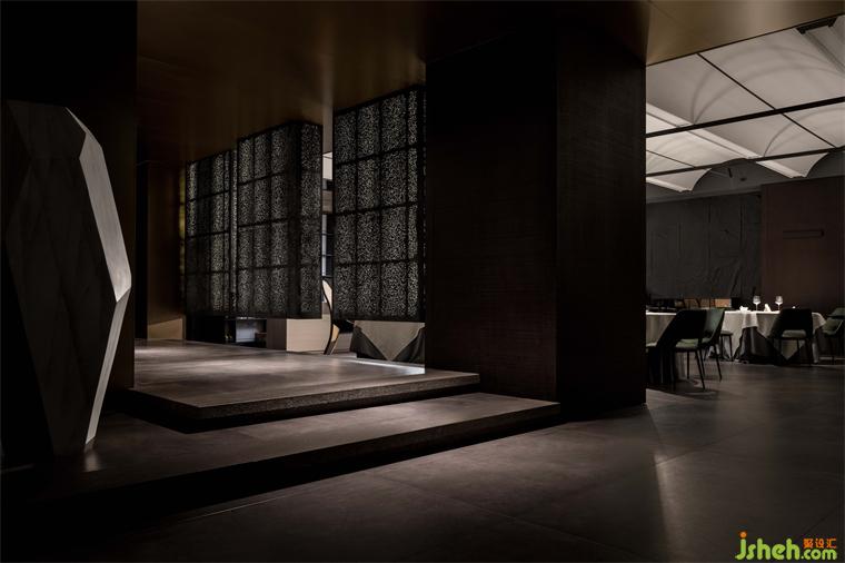 东方之美,美在其温婉。整体以含蓄的叙事方式,粤餐馆设计将东方人的审美意境娓娓道来。连廊上、中厅处,运用大体块、悬挑的构成手法,围合出引导流线,形成“似间若隔,欲露还隐”的空间效果,犹如画卷一般徐徐展开,引人探幽。