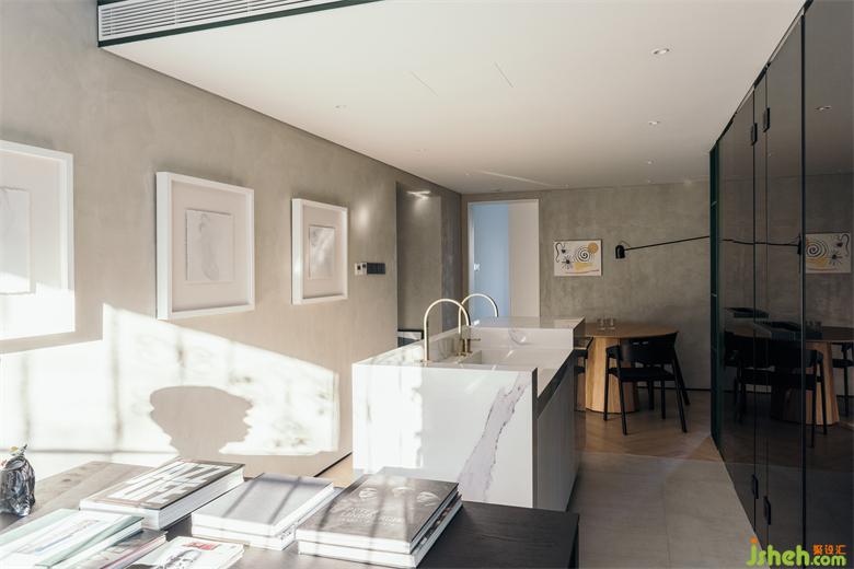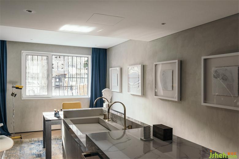 在一楼东侧,就餐区、阅读区和洗手台连通在了一起。这种南京家装设计手法并非常规,但敞开的布局也能使房间充分享受阳光带来的乐趣。