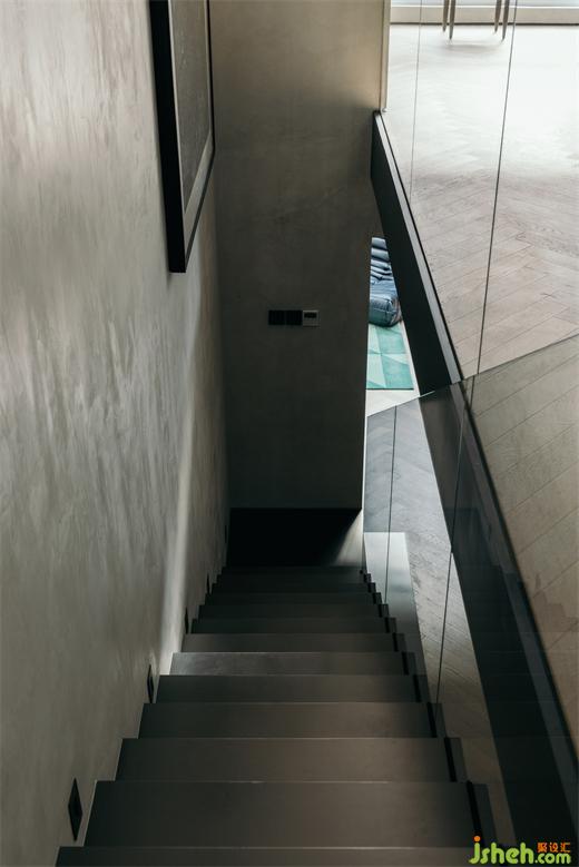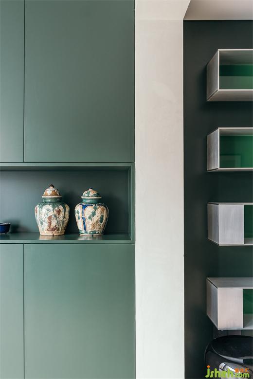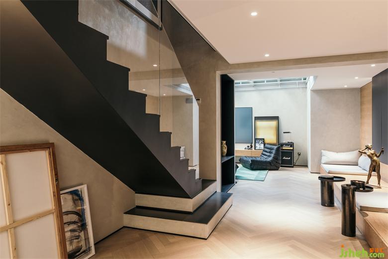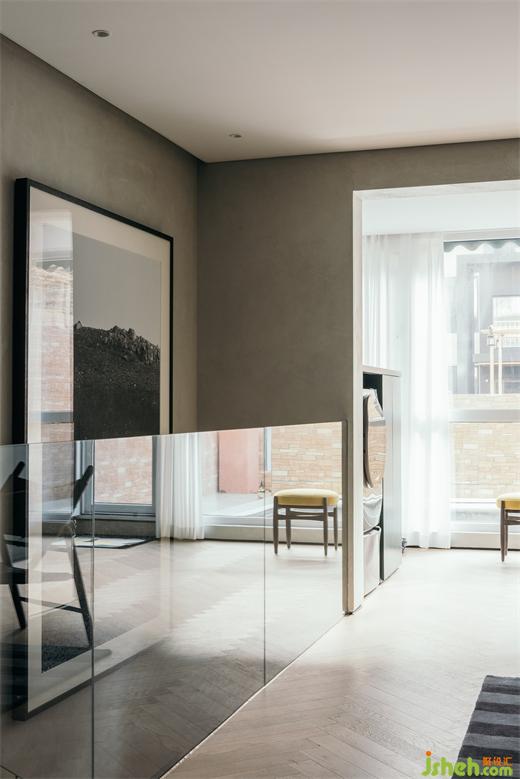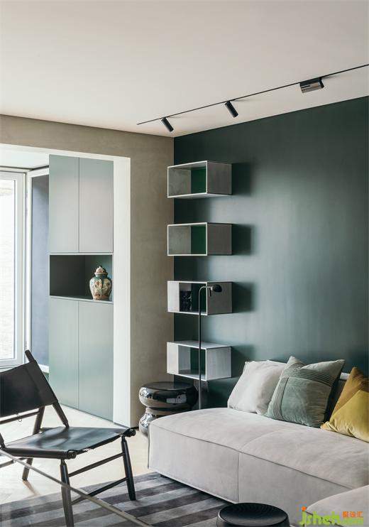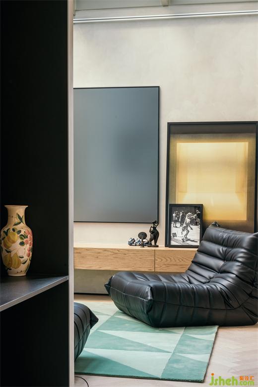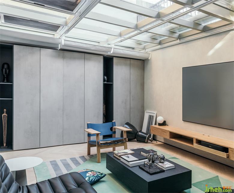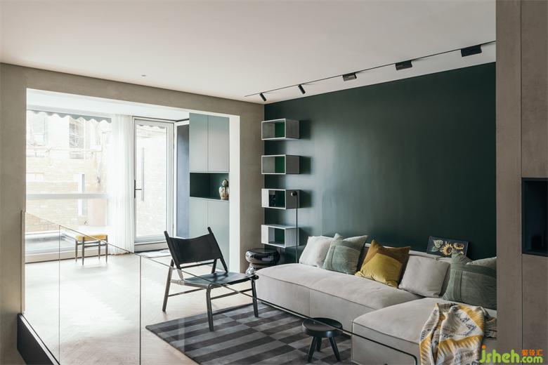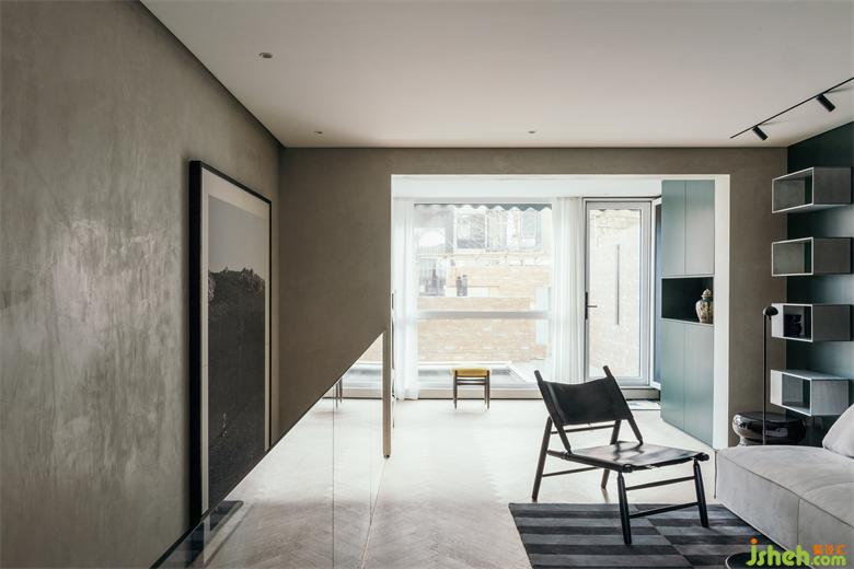 南京家装设计除了位于厨房一侧的入户门,在客厅南侧也有一扇入户门,可通往外边的小型花园。客厅墙面上固定着由厚铝板制成的置物架,成为这里的视觉焦点。