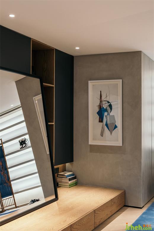 A bamboo screen from the 1980s is placed at the junction of the sneaker display area and the bathroom, which contradicts and but units with the modern carpet, providing a certain sense of security in an enclosure form while balancing the overall style.
