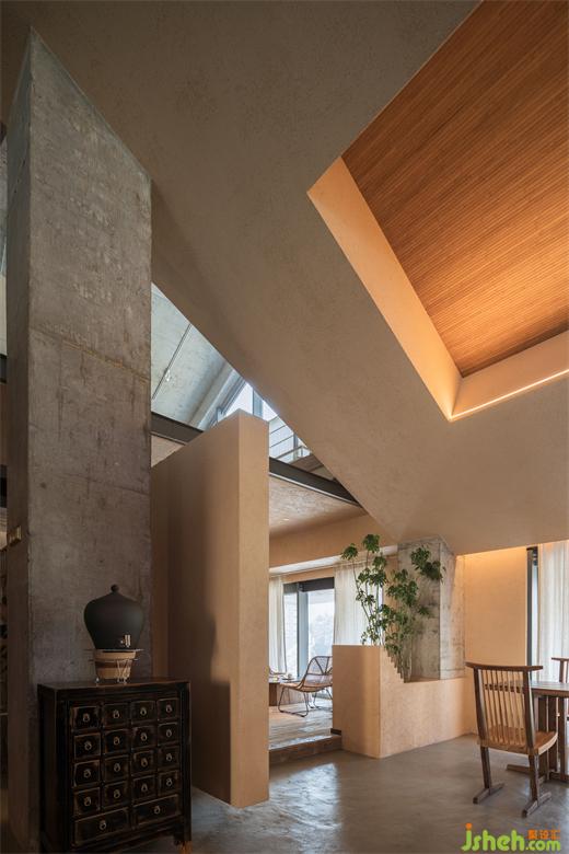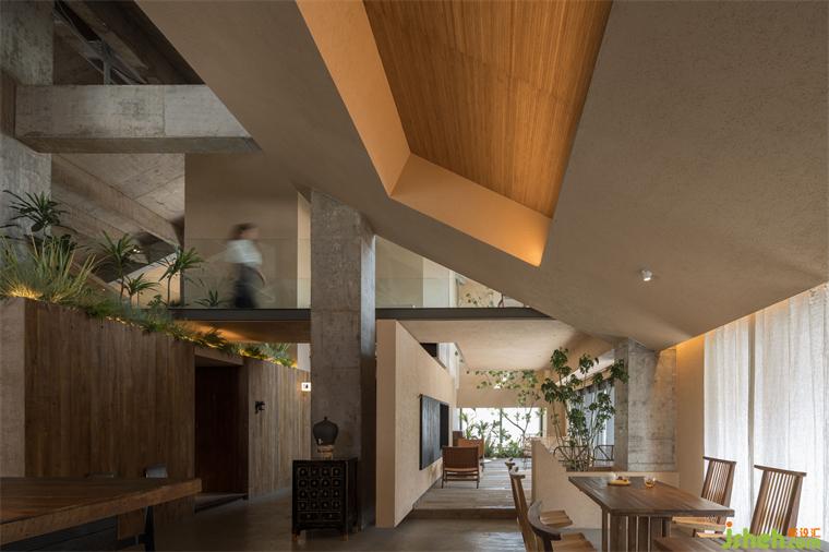 在设计中,我们采用了一种独特的方式来打破原有稳定的空间轮廓。通过置入建筑盒子,创造了一种动态的漂浮感,重新组织了室内外的视线关系。这种设计让人们从一楼到二楼逐渐感受到私密感的递增,同时玻璃廊道的连通使空间保持了视觉上的分离。我们希望设计能够提供更多的视觉穿透角度,让人群之间的眼神可以互动,消除彼此的陌生感。餐厅设计同时,我们还重构了传统四川街巷的立体化,让这个空间不仅成为日常活动的场所,更成为城市文化、历史和社交交流的重要载体。让人们在这里更加融合,更加亲近。