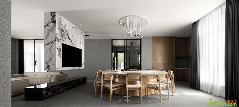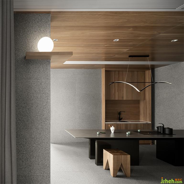 这是一个以私宅为背景的会所设计空间,既有接待娱乐的高级体验感同时也保留私宅具有的惬意随性。天然的麻石和原木色的搭配容易让人产生一种轻松感,使空间保持着开放性,含蓄却不低调