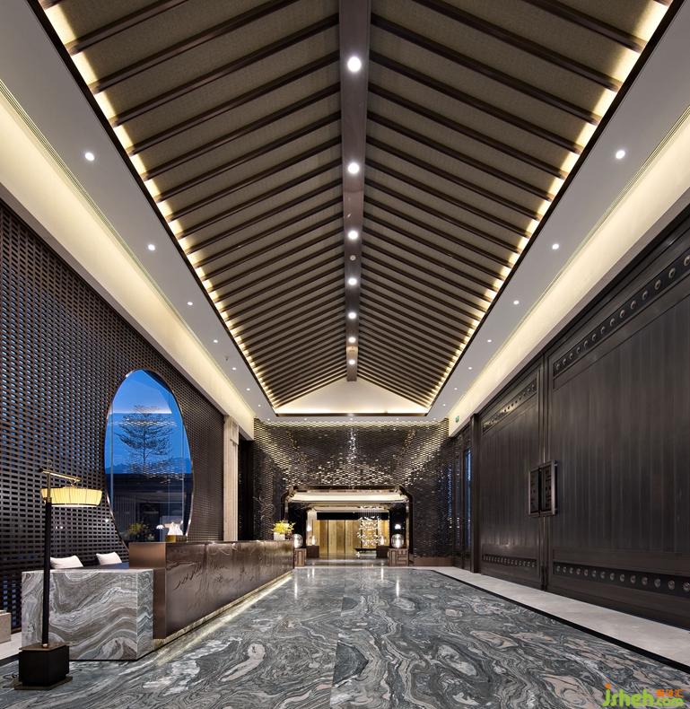 暖褐色金属门楼,创造礼仪感与品质感的营销游览动线。简约大气的冷灰色石材,流畅的水云纹理融入地面景观空间,身处曲水流云的度假天境。入接待前厅,月洞形格栅屏风运用中式园林框景手法把院落景观映入眼帘。精选紫山水大理石与锻打山水纹的古铜接待台完美契合,尊贵而高雅用现代手法展现禅意韵律。