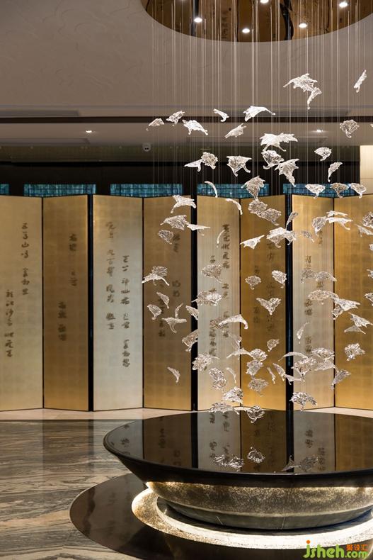 穿过前厅,往右来到企业文化展示区,金箔屏风诉说着指点江山的激昂文字,屏前的水晶灯饰编织着一个奇幻的美梦。