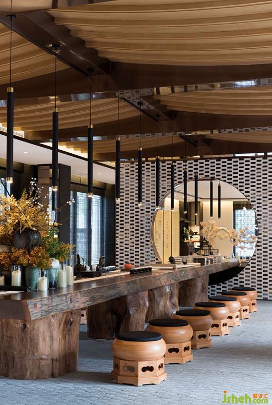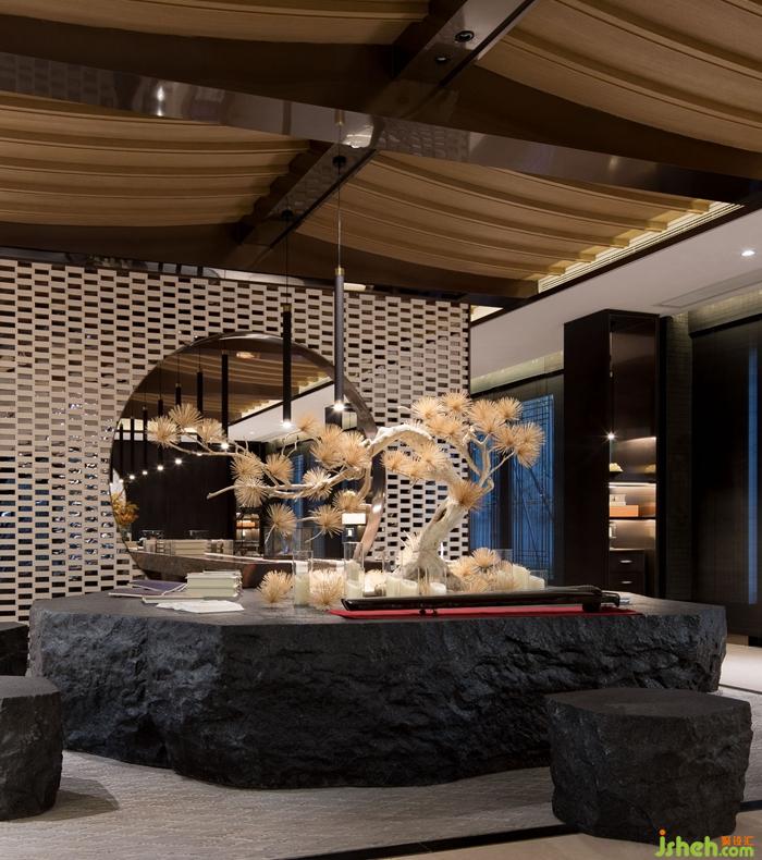 作为茶道、琴道、文化体验的休闲区,我们可以营造出东方意境的雅致生活。厚重的天然花岗石台结合整版红木茶台穿过月洞穿插在一起。石台上古松婀娜,端头一组别致的花艺收尾。在这之间,抚琴,品茗,阅书,绘画,乐享其中。