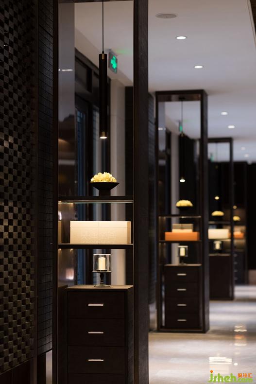 通过前后对应月洞的形式,影影绰绰映出售楼沙盘区的熠熠星光。沙盘区取名“楼·碧云边”,沙盘背景是三进的最后一道月洞格栅,结合起伏连绵的山形,恰到好处的提炼了主题,使之连贯不同的空间。在神韵上融会贯通,构成层次丰富而统一的空间意象。