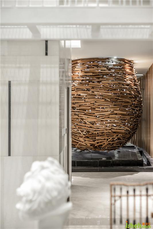 地下二层是逍老师的艺术工作区,一侧悬挑的“孤鸟”之巢造型茶室外观,“与我无关”的个性存在,契合逍老师的心境,思考、独处、想象,“涉事”,随意做了一些创作而已。