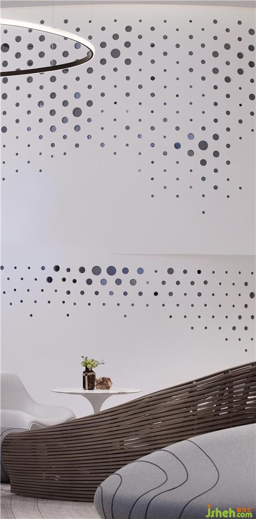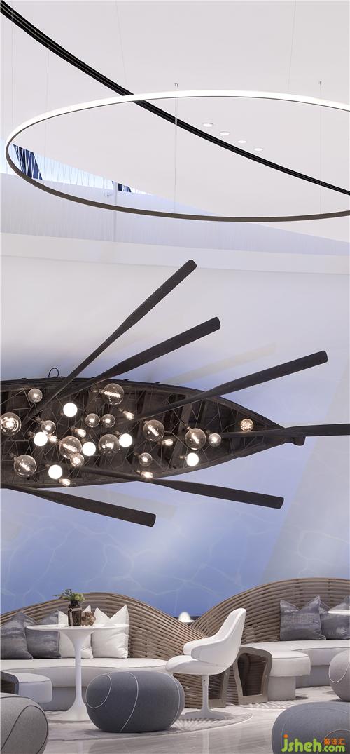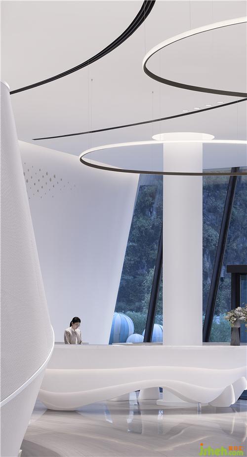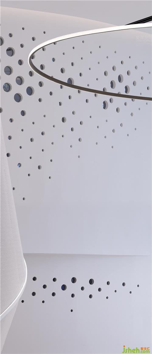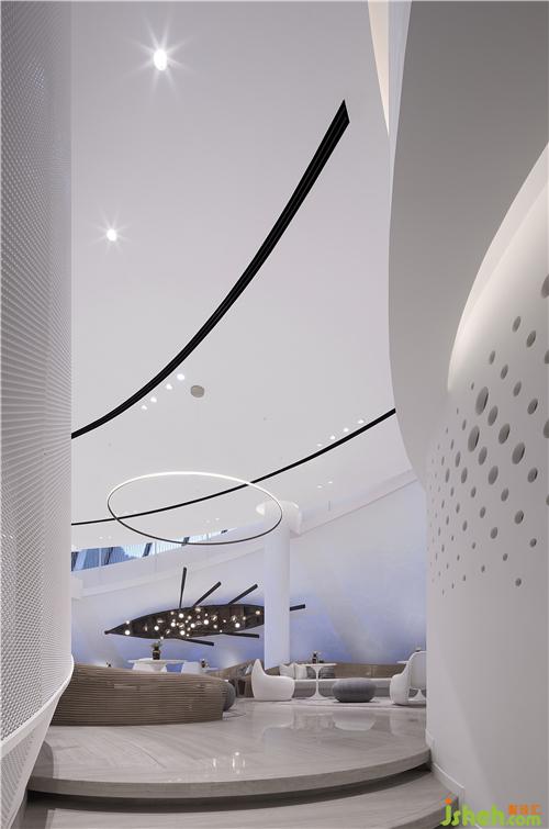看似简单的旋转重复,其实是在不同的维度上不停的迭代重生,所以围绕着中心圆形的“凤凰之眼”,售楼处设计我们营造了轻盈如飘带般的莫比斯环,每一个进入艺术中心的人在环形的空间中参观游走时,都是围绕着它,并且它仿佛是不停地在旋转向上,给人很生生不息的心理体验感。