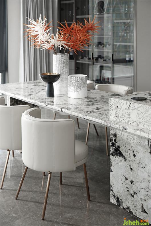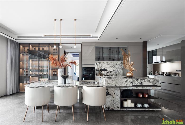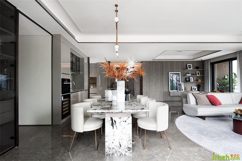 整个家庭的社交中枢:会客、就餐、厨房位于一条轴线,南北通透、动静分明,在“场域化社交”中还原家庭空间的场景化。大尺度公区内,安排了“会客区”、“私宴区”、“岛台区”和“奢尺烹饪区”,大方厅270°落地玻璃全景阳台,则是完美的“自定义空间区”。