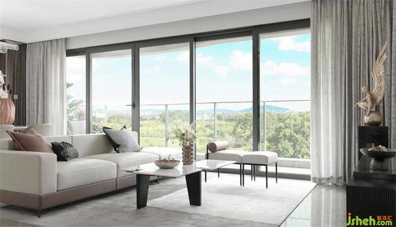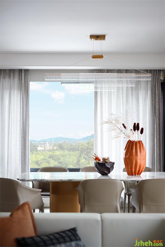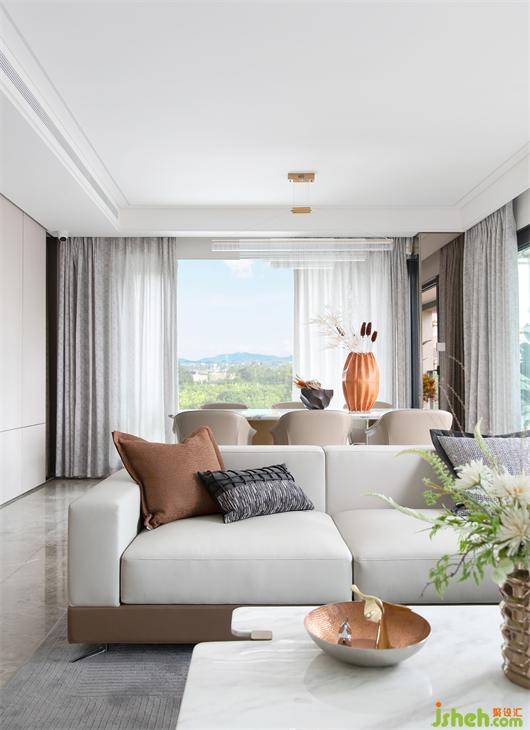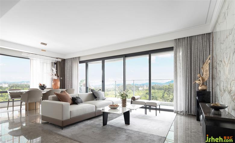 客厅俩面的大落地窗设计让自然光线最大限度渗透进来,在不同的立面照射出不同的色泽,日落时分,光线变得温柔,照进室内,在光亮的沙发皮面、平滑的大理石茶几,与柔软的织物地毯上,留下短暂的柔软时刻,也令材质本身显露出各自肌理与色泽。淡雅的灰调,用稳重的木褐色调和,没有夸张与炫目,而是低调,又细腻地表达出对生活品质的追求。