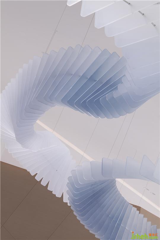 我们在连接产业板块和住宅板块的长廊上空做了一个大型艺术装置《极光》,灵感来自于刘慈欣的短篇小说《梦之海》,低温艺术家以宇宙的尺度来创造艺术。我们用一片一片的亚克力创造了一个现实版的物化的、飘渺的、波光鳞鳞的、充满神秘感的极光,寓意终极之美。