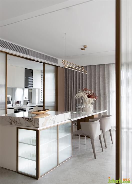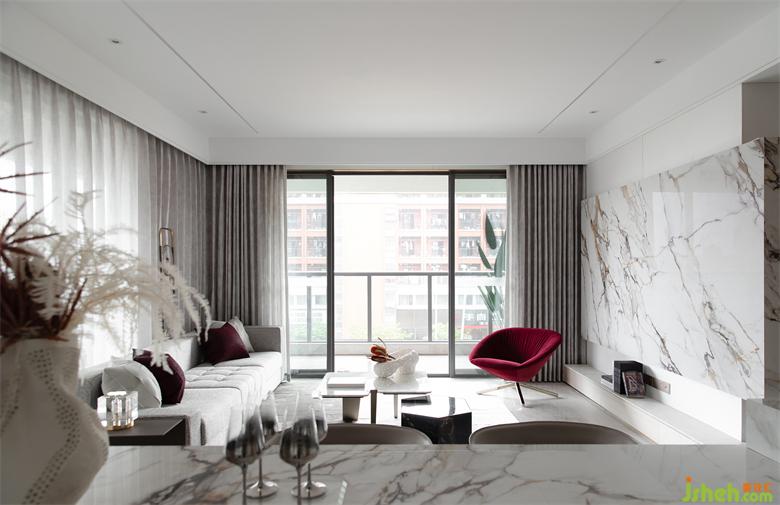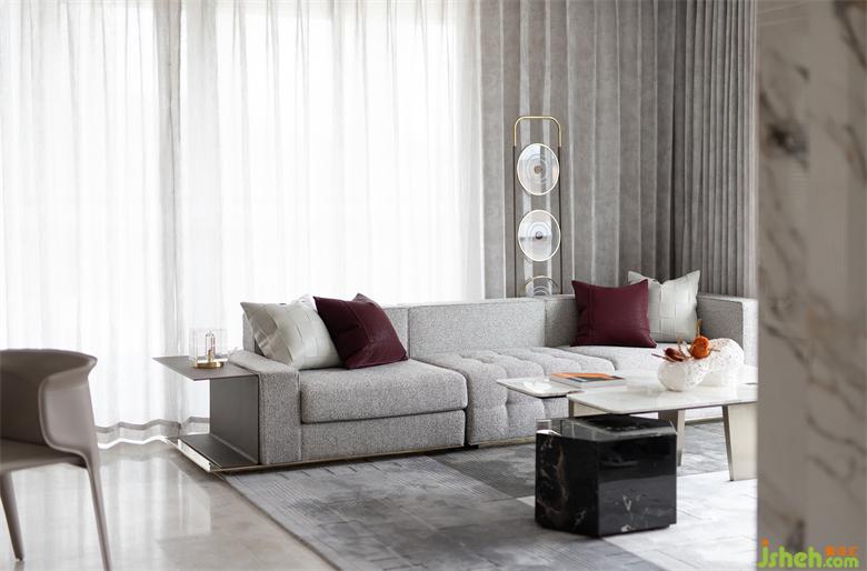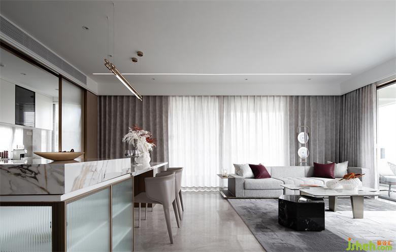 客厅270°环景的设计让自然光线最大限度渗透进来,样板房设计在不同的立面照射出不同的色泽,光形成影,光影之间的转变显得更鲜明层次,空间也就有了灵魂。有了生命感,更加让开放式公共空间消融了社交与生活的边界。