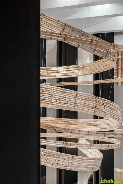 视觉终端的大型旋转楼梯是通往二楼的主通道,楼梯底部踏步结合水景,长沙售楼处设计组合成名为“汲泉”的室内活水造景。站在楼梯上倚栏回望,整个空间尽收眼底。