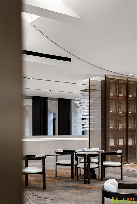 二楼开放式的洽谈区被命名为《御书楼》,长沙售楼处设计开放式的布局结合半通透的书架将空间适当分隔,让客户在此达到身心愉悦的洽谈体验。