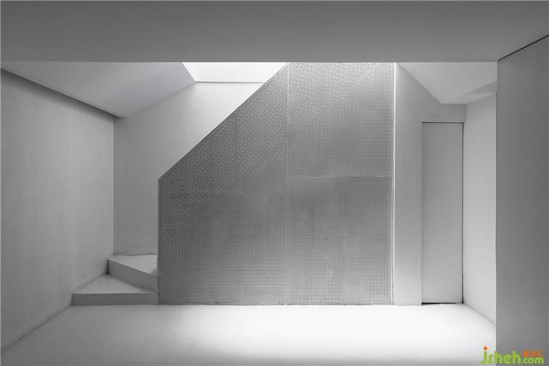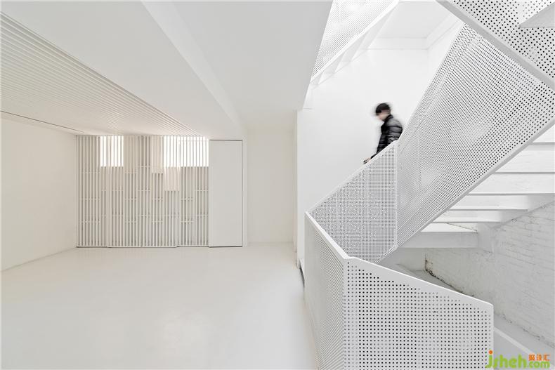 原建筑楼板被部分的切除,使楼梯空间变成一个穿越内部各层的光筒。透过天窗,别墅装饰富于变化的自然光可直达各楼层,为封闭的室内空间带来新的活力。2公分厚钢制楼梯踏板和5公分穿孔钢板扶手,使楼梯成为既光滑又可透光的道具。游走其中,人会有腾空之感。楼梯背后则保留了裸露的砖墙喷涂白漆,形成新旧材料的微差。