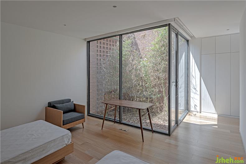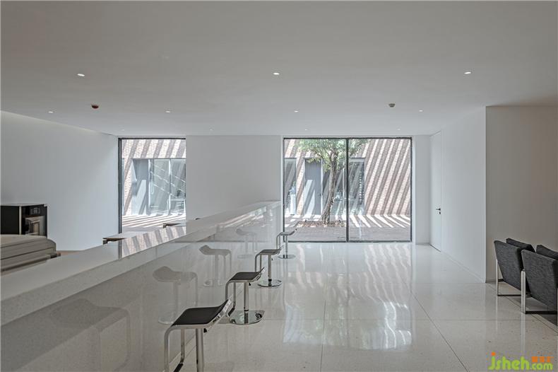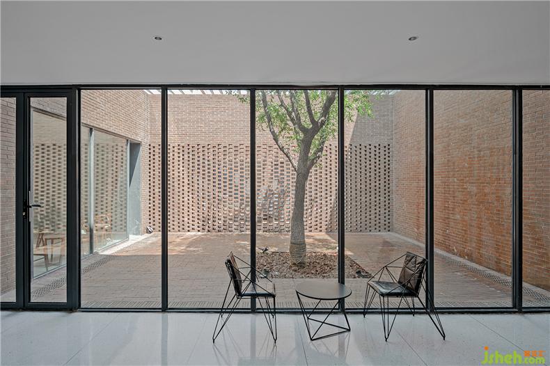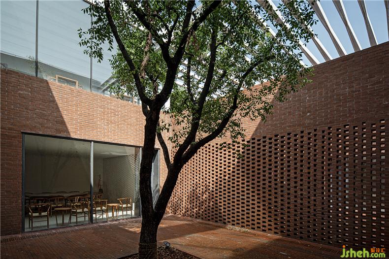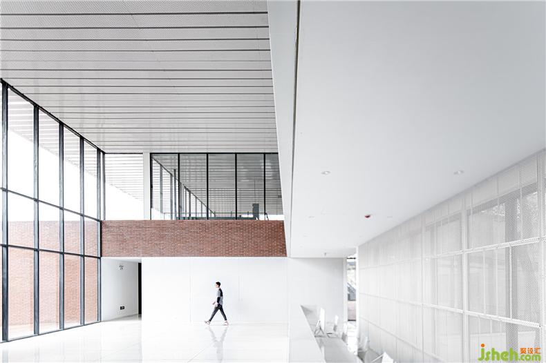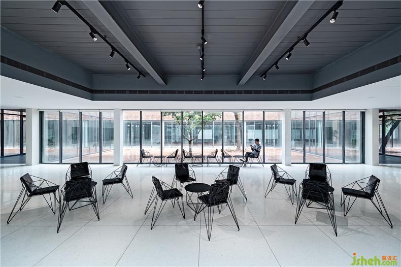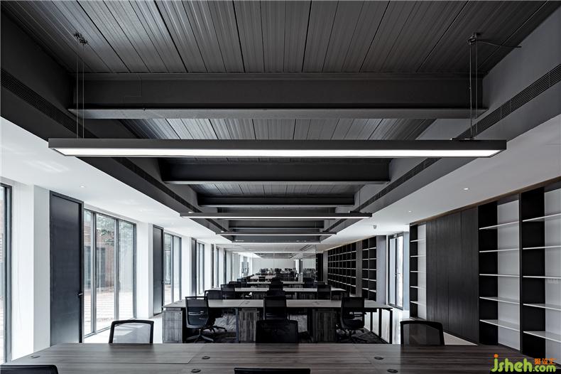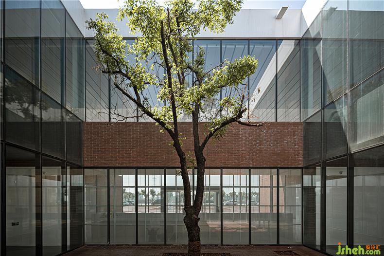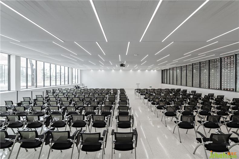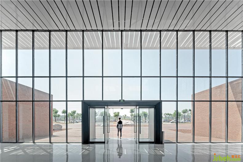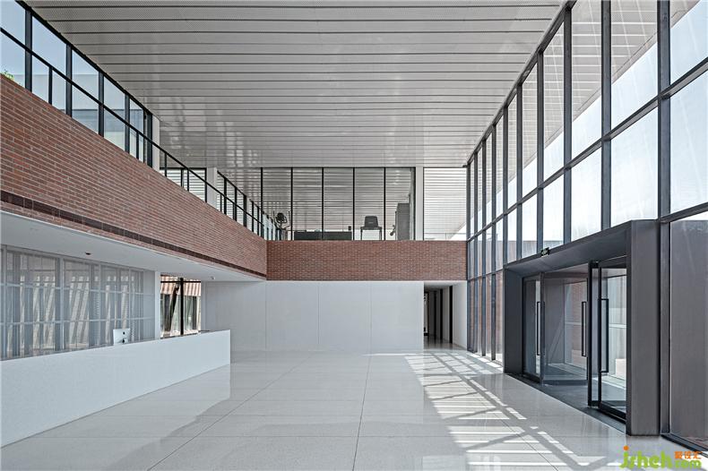 一片面积约4000平米的平屋顶+遮阳格栅覆盖了整个建筑场地。办公室设计屋顶遮阳格栅设计意象来自于周边农田景观的线性肌理,并结合方格网结构与平直楼板产生“柔化”的效果。遮阳格栅会产生由建筑中心向两边产生由密到疏的渐变排列,每一条格栅本身也存在着弧形的宽度渐变,同时铝制格栅表面穿孔以弱化实体感,由此将钢结构屋面与遮阳系统结合为一个整体的大屋顶。半透明感的屋顶宛如阳光下一片巨大的灯罩,其下的建筑和庭院自然演变为光影的森林。空间跟随着一天之中阳光的变化,光影的韵律交织叠合,与人的活动一起共同演绎生动的自然场景。