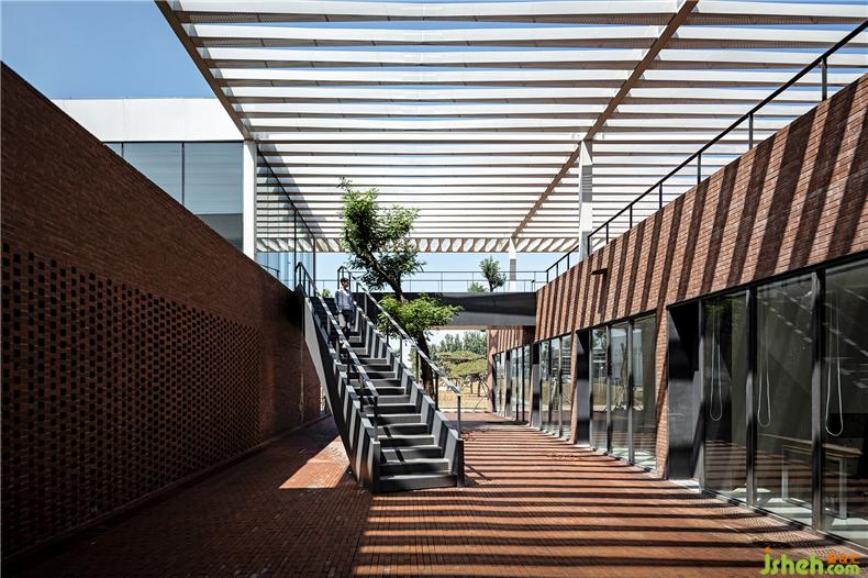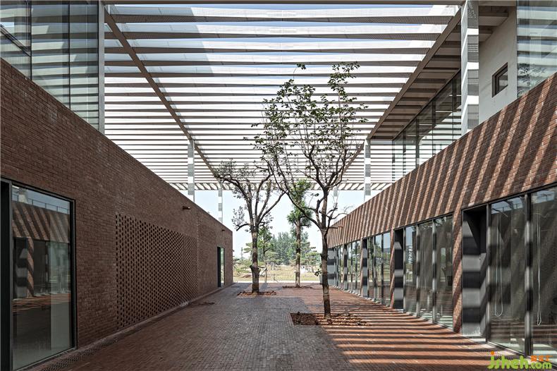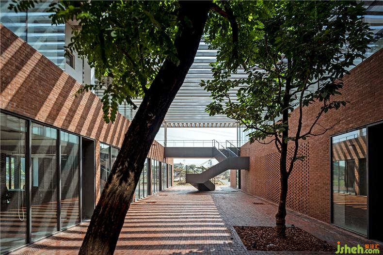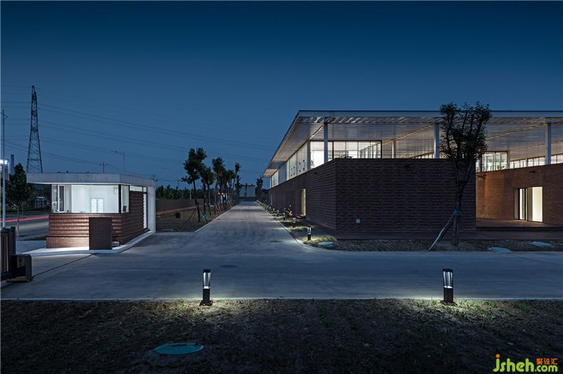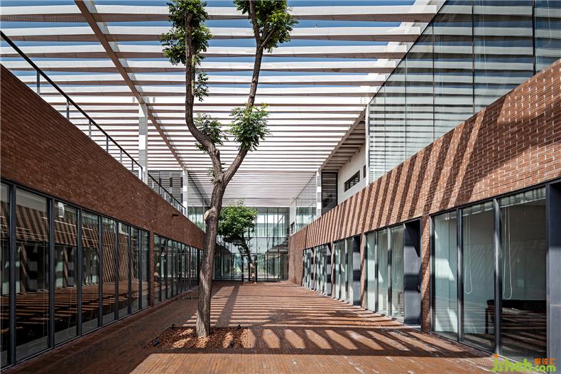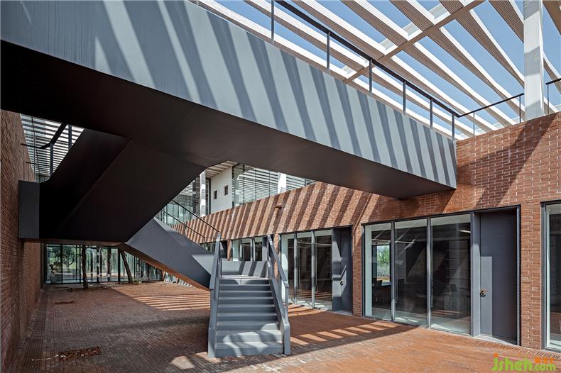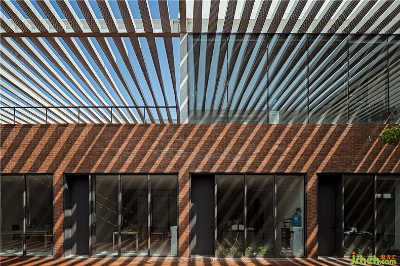 建筑在材料使用上较为克制,注重材料与空间的逻辑关系、办公室设计内外的一体化以及材料语言自身的表现力。建筑的前广场、首层外墙和二层楼面均使用了红砖这一该地区历史建筑较为典型的材料,结合办公楼建筑形态构成了由南向北连续起伏的砖肌理地表。红砖的砌筑方式与所在位置、开口方式、功能要求密切相关,并在砖地表的不同区域产生凹凸、错叠、渗透等的变化。在砖盒子界面之间,室内外连桥、楼梯、门窗框以及部分室内台面等均采用钢板材料,部分室外地面还做了防滑处理。办公室设计砖盒子的内部被处理为统一的浅色背景,使用了水磨石、涂料等。在砖盒子之上,二层空间内外均使用穿孔铝制格栅吊顶,照明、空调、设备等管线隐藏其中,形成完整的空间界面,与粗糙的砖表面形成对应。