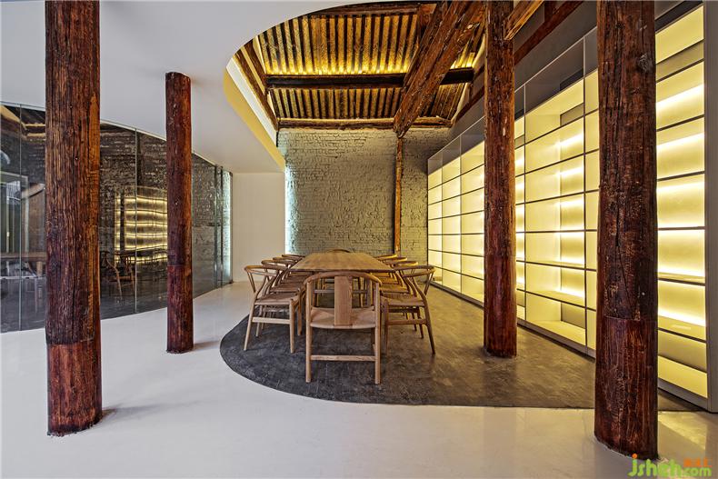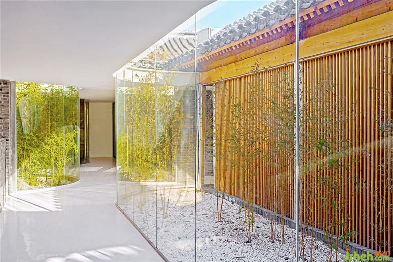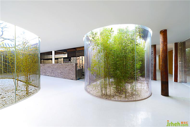 2.植入新的。旧有的建筑格局难以满足当代环境的舒适性要求,室内设计师新的建筑必须能够完全封闭以抵御外部的寒冷。为此,我把建筑中的流线视觉化,转化为“廊”的形式,在旧有建筑的屋檐下加入一个扁平的“曲廊”将分散的建筑合为一体,创造新旧交替、内外穿越的环境感受。在传统建筑中,廊是一种半内半外的空间形式,它的曲折多变、高低错落,大大增加了游园的乐趣。犹如树枝分岔的曲廊从室外伸展到旧建筑内部,模糊了院与房的边界,改变院子呆板狭窄的印象。轻盈、透明、纯白的廊空间与厚重、沧桑、灰暗的旧建筑形成气质上的反差,新的更新、老的更老,拉开时间上的层叠,新与旧相互产生对话。曲廊在原有院子中划分了三个错落的弧形小院,使每一个茶室有独立的室外景致,在公共和私密之间产生过渡。曲廊的玻璃幕墙好似一个悬浮地面之上的弧形屏幕,茶楼设计将竹林景观和旧建筑形式投射到茶室之中,新与旧的影像相互叠加。曲廊同时具有旧建筑的结构作用,廊的钢结构梁柱替换了局部旧建筑中腐朽的木材,使新与旧“长”在了一起。