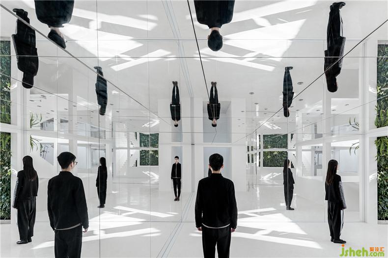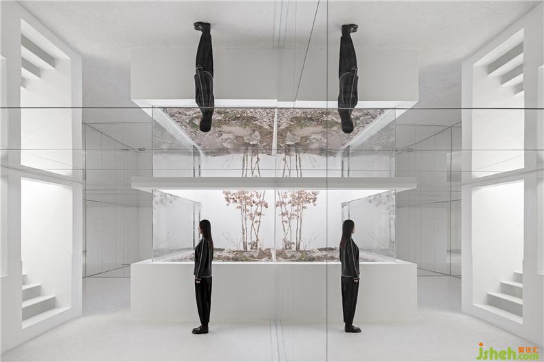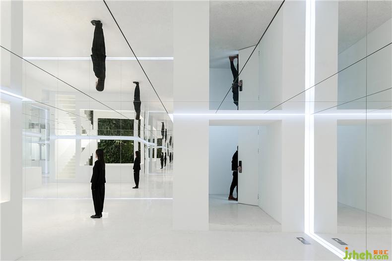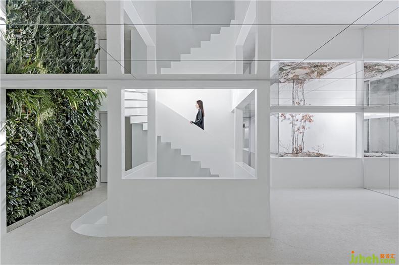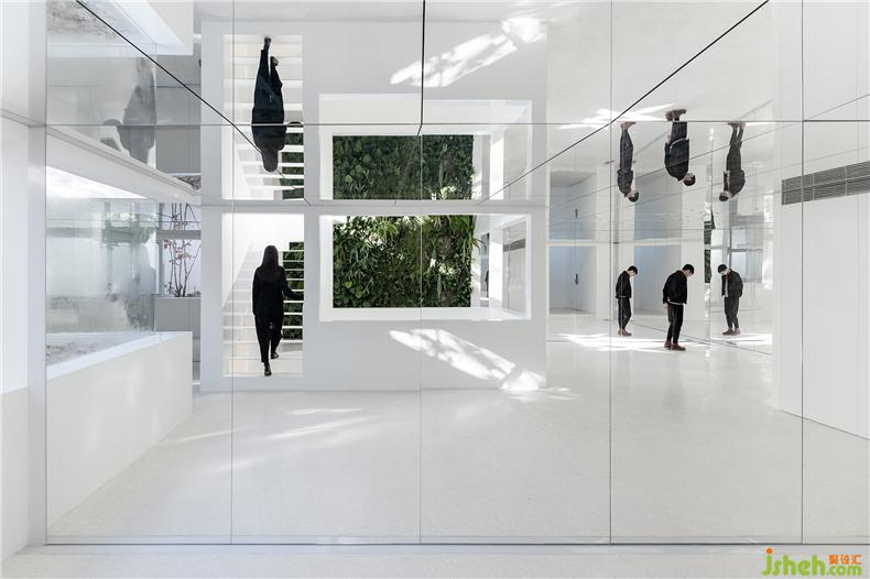 设计的主要思路是运用镜面和植物庭院尽可能的让内与外产生联系,室内设计师在略显局促的有限空间中创造无限视野,把建筑转变成容纳多样场景和体验的“花园”。三个庭院化的空间将建筑内部立体串联起来,让室内有充足的阳光和植物景观。由胡同经一个带有天光的前厅转折进入建筑首层,这里是家具、产品的展示和售卖区。在这个镜面空间之内,人、器物、家具与植物景观相互映射,实像与镜像叠合交织于一处。沿着交错的楼梯向上,经过6米高的垂直绿化墙面可到达二层阁楼。平面呈L型的厨台和餐桌由水磨石整体打造,让就餐者与厨师产生密切的互动。阁楼带有一南一北两个露台,室内活动随时可以向室外延展。室内设计师地下一层被改造为服装、鞋帽的展示和售卖区。发光地面作为鞋帽、产品的展台,同时补足地下空间的光。精选的服装悬挂于一个镜面空间之中,人与物产生有趣的关联。室内设计师室内照明全部采用智能控制,镜面空间内嵌可变色的灯光,可以满足不同活动、场景的使用要求。