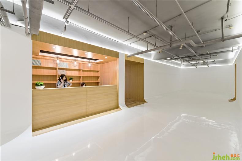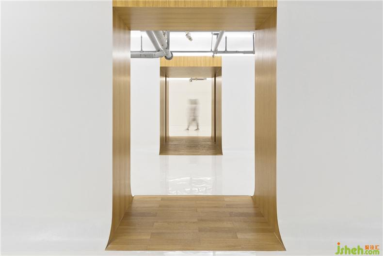 设计目的:门面以6米高的白色钢板墙取代了以前的玻璃立面构成崭新的入口形象,室内设计师加强画廊外观的识别性。室内设计围绕三个规整的长方形展厅展开。展厅犹如抽象的白色舱体,柔和的弧形转角模糊了墙面与地面的边界,使视觉空间最大化。展厅顶部直接暴露结构管线以获取最大的高度。展墙与原有空间边界剩余的部分则成为“空心墙”-一系列由橡木饰面板包裹的服务空间,室内设计师包括前台、办公、茶室、楼梯、卫生间等,这些小尺度的房间尽量采用隐蔽光源和可触摸的材质,安宁、温暖的感受与光滑亮白的展厅构成反差,置身其中仿佛窥视者墙体的内部。