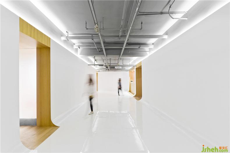 项目简介:这间画廊位于居住社区的沿街商业楼之中,主要使用空间在二层,室内设计师通过狭长的楼梯连接到街边的出入口。室内面积约三百平方米,形状较不规则,且存在较多的结构柱和墙。基于室内复杂的结构、管线和有限的高度,设计以柔和的墙体介入并整合原有建筑格局,利用尺度、光线和材料的变化激发空间的潜力,创造纯净、完整、高效的展示环境氛围。