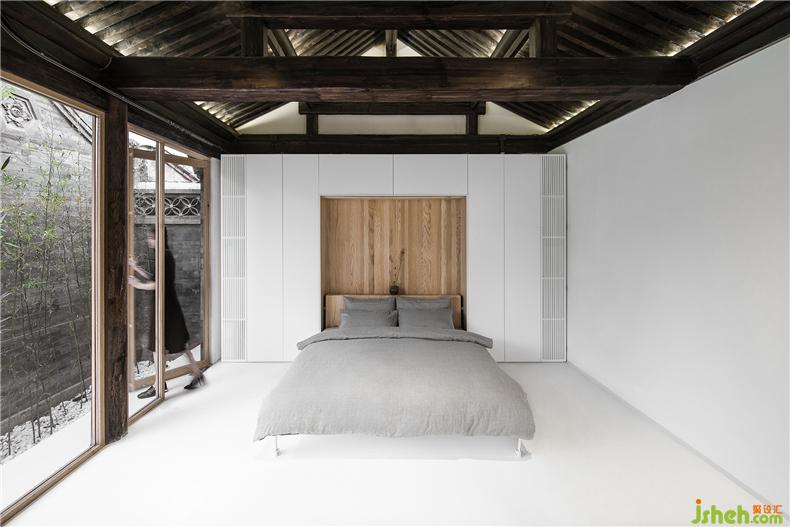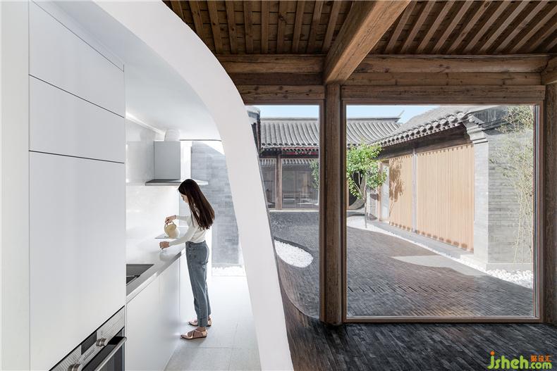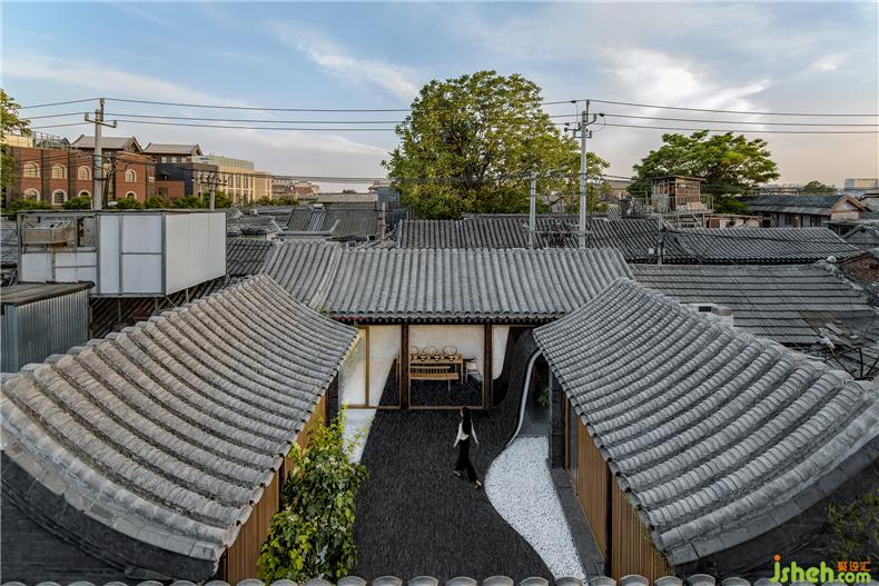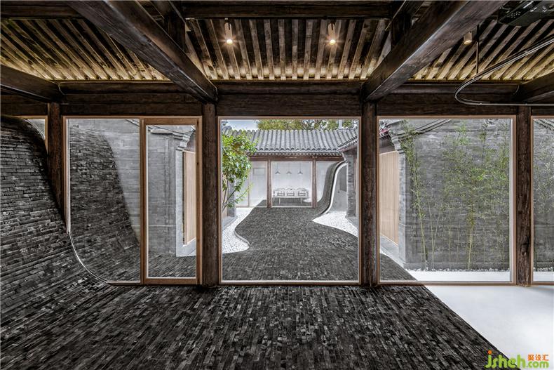 改变原本四合院的庄重、刻板的印象,营造开放、活跃的院落生活氛围。别墅装饰基于已有院落格局,利用起伏的地面连接室内外高差并延伸至房屋内部扭曲成为墙和顶,让内外空间产生新的动态关联。隐于曲墙之内的是厨房、卫生间、库房等必要的服务性空间;显于曲墙之外的会客、餐饮空间与庭院连接成为一个整体。室内外地面均采用灰砖铺就,院中原有的一颗山楂树也被保留在扭动的景观之中。