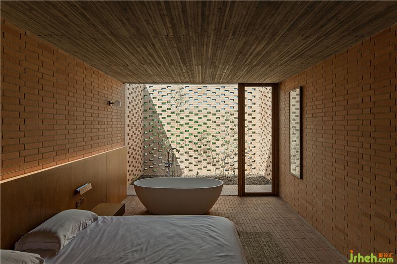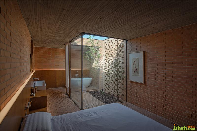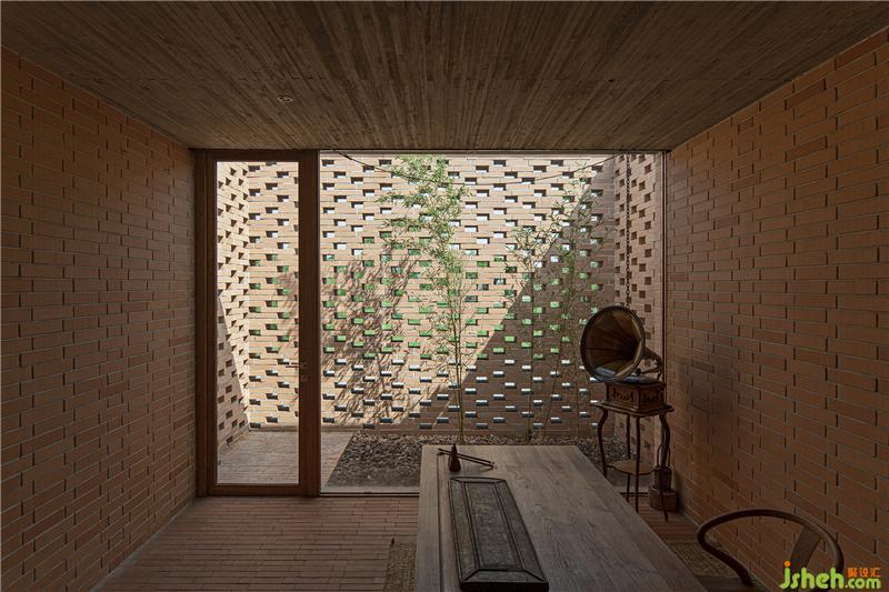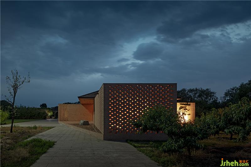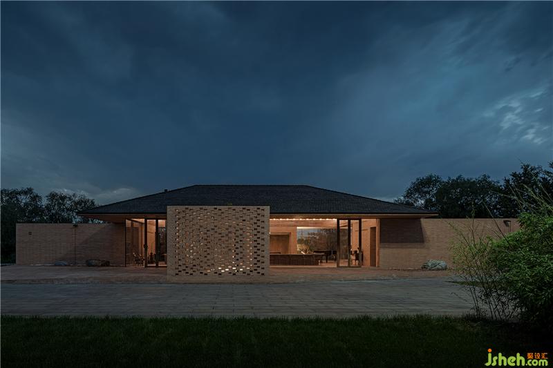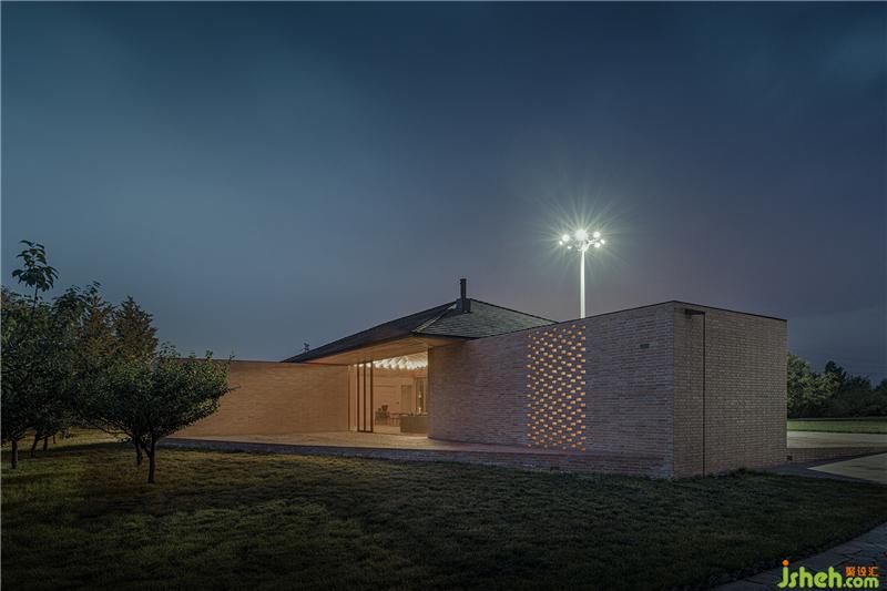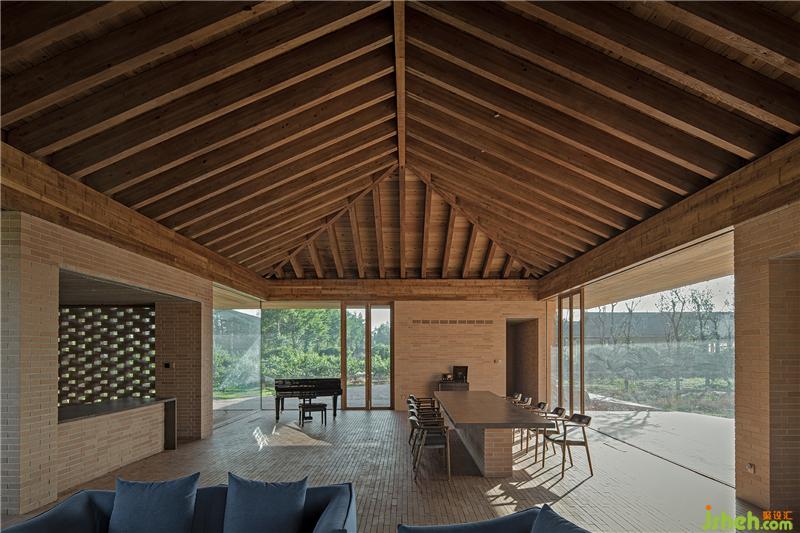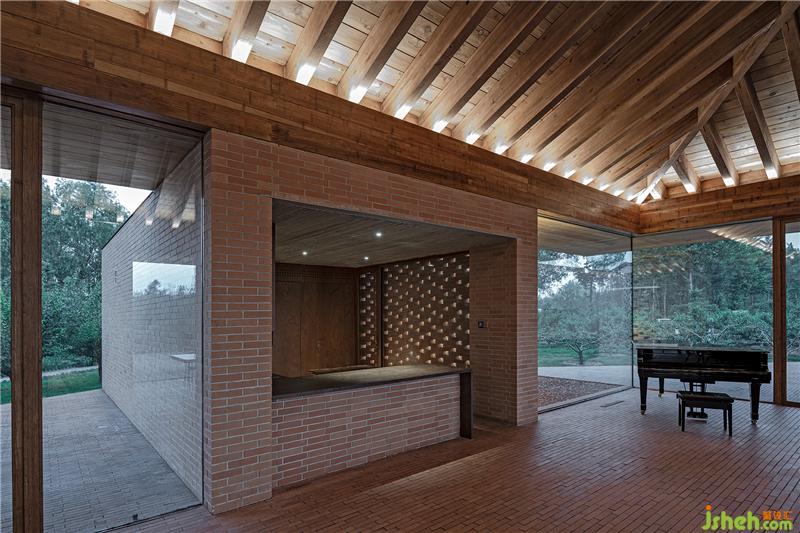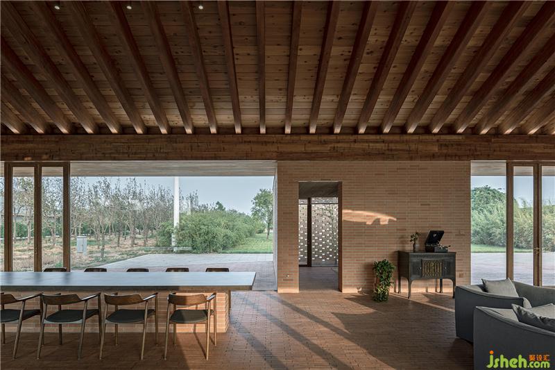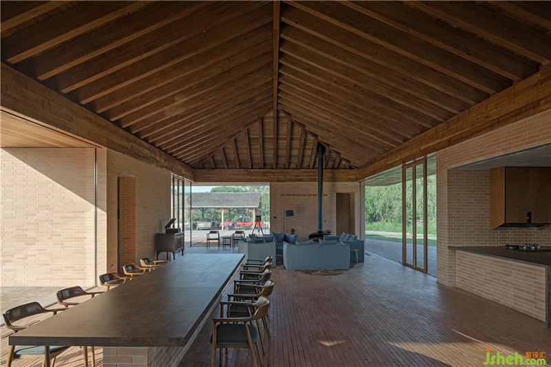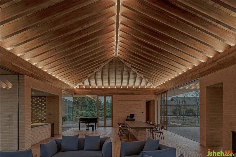 控制空间、结构与材料的逻辑关系,围绕乡村休闲空间的基本特征,呈现物料的本真之美。四间房屋采用钢框架+混凝土板,现浇木模板混凝土顶板直接显现于室内空间之内。墙面使用了一种米黄色页岩砖。设计利用双层清水砖墙构造,在墙内空腔设有保温层,保证热工性能的同时,也保持了内外一体的砖材料肌理和质感,并隐藏结构、空调等设备管线。唐山别墅装饰墙面在庭院部分由实砖渐变为漏砖,让房屋内外保持着光线和空气上的流通。室内外台基地面也全部由米黄色砖铺砌而成。公共空间屋顶采用了木结构密肋梁,屋面覆盖火烧板屋面瓦。木与砖材料的结合,共同营造出室内空间朴素、温暖、自然的氛围,并且由壁炉、餐台和钢琴进一步定义了不同公共活动区域。