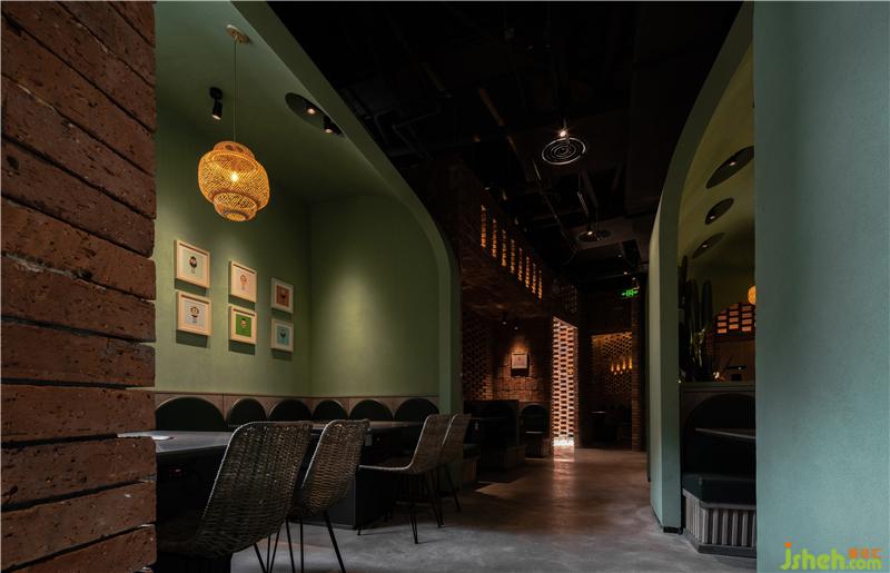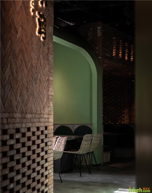 在灰绿色水泥的对立面,红砖作为空间另一种主材,形成了有趣的色彩互补和质感碰撞,设计师将这两种美学元素并置在一起,前者体现优雅格调,后者则流露出文化沉淀后的底蕴,而兼顾生活感和艺术感,也是提升消费者品味和凸显品牌格调的一种方式。红砖墙堆砌与拼接的设计,不只是一道隔断,传统的工艺会赋予它力量感,光线也会随着时间透出神秘的感觉,在实虚交互之中,人们会从间隙中渗出诗意,粗狂但很浪漫。