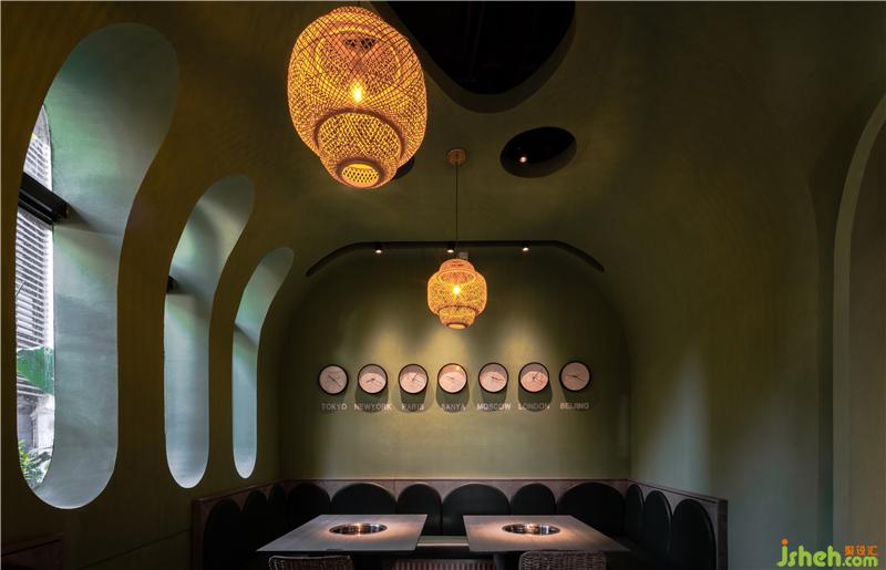 餐厅设计上选用了世界各地不同时间的圆形钟表,提醒着“椰小鸡去旅行”行走世界各地的主题,而墙面上的黎苗文化涂鸦也再次点题海南的本土民族文化。