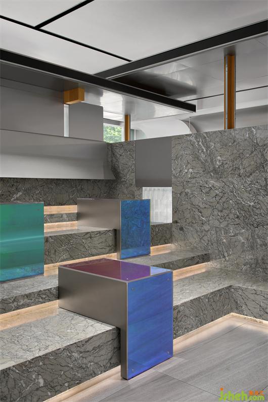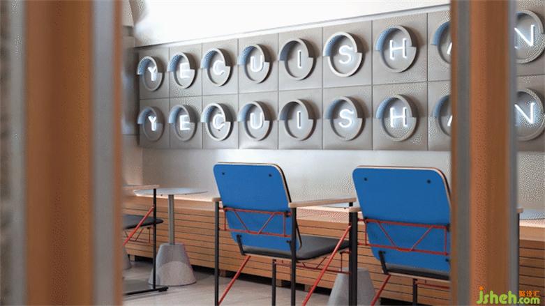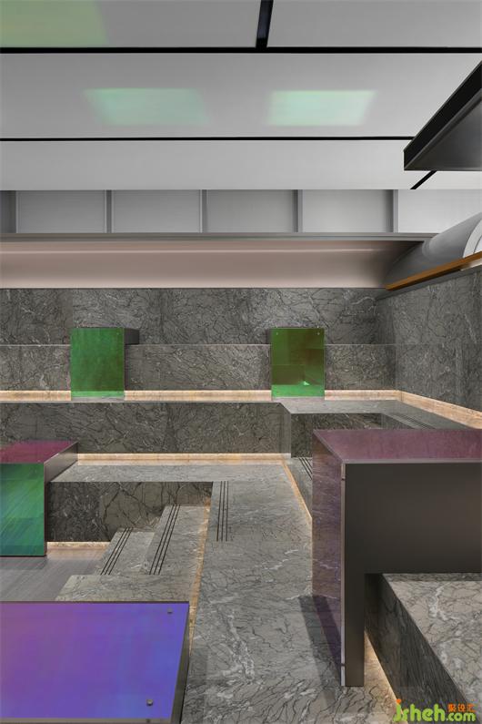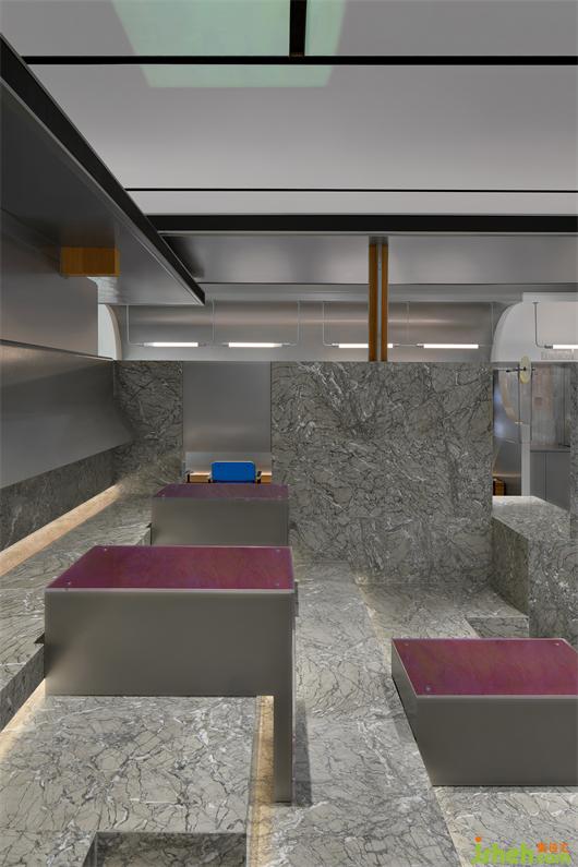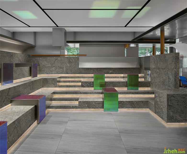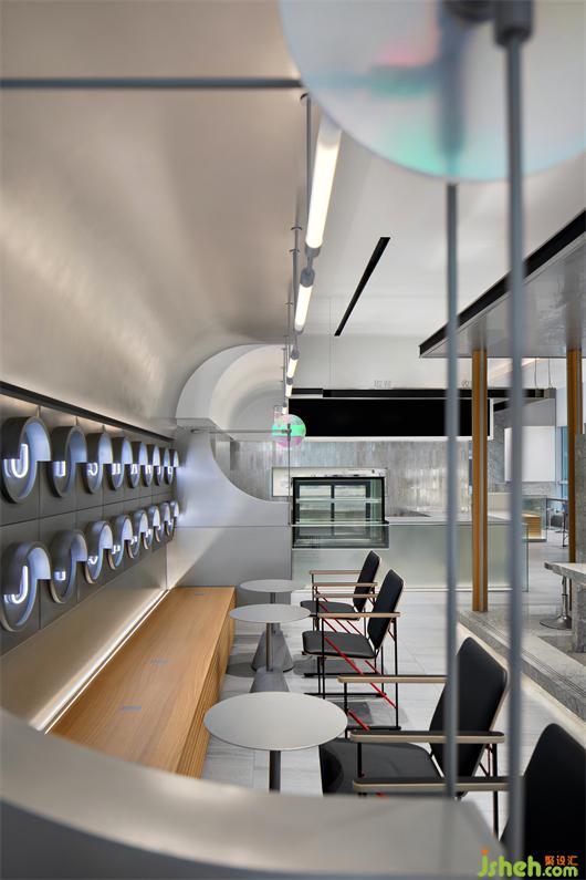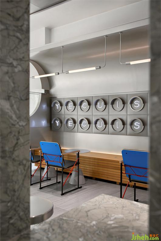 野萃山设计以建筑设计的手法在大盒子设计出“房中房”,打破社交隔阂的开放式阶梯座位让离开办公室的人们不必再正襟危坐。墙面、台面以交错立体的形态在空间里形成多功能体块,品牌可联名艺术家、插画师来举办作品展览。天花上的多媒体屏用水果动漫小游戏增添空间的互动性和趣味性,亦在不断强化品牌的分子果汁特性。将消费者对于生活态度的表达与品牌调性的输出相结合,寻找精神上的交集与共鸣。
