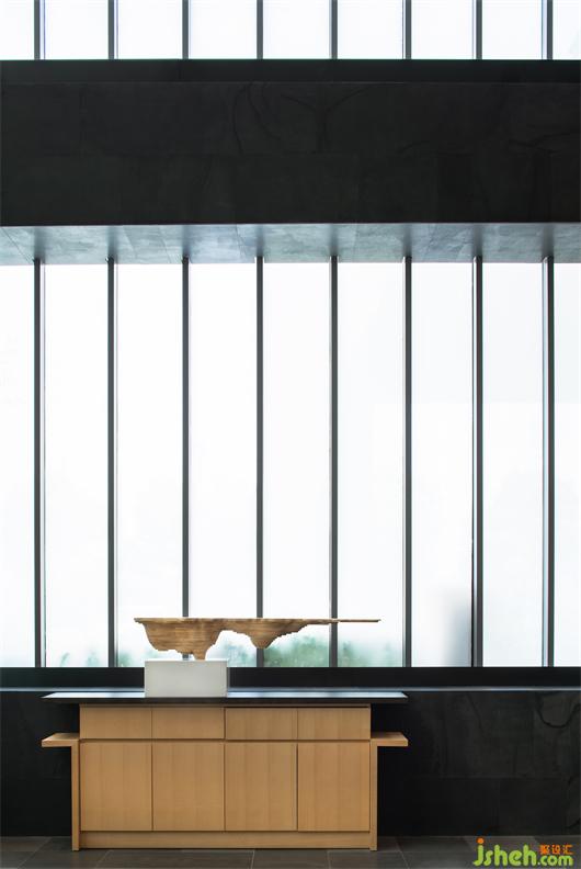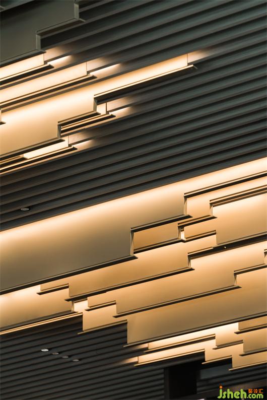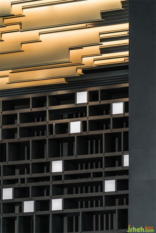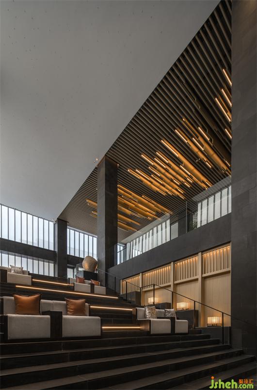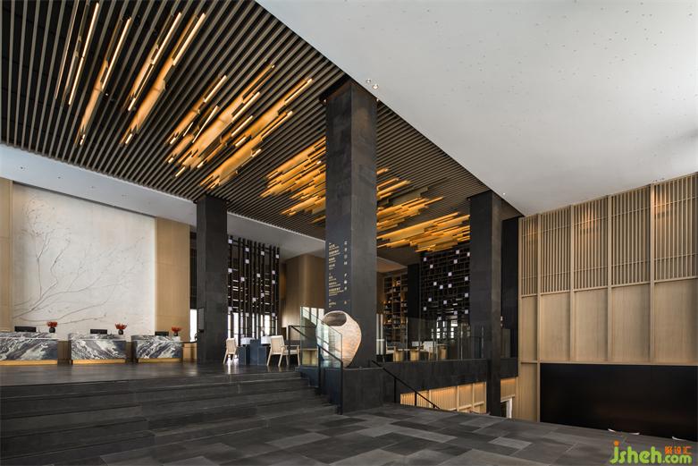 酒店公区大堂的天花设计与建筑外立面的马头墙艺术装置相呼应,并以暖色灯光塑型,在以黑白色主调的大堂里形成视觉亮点。