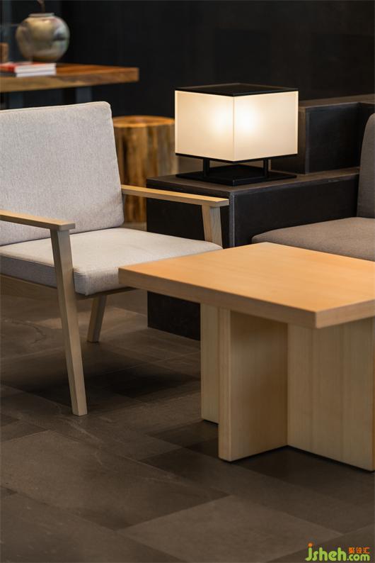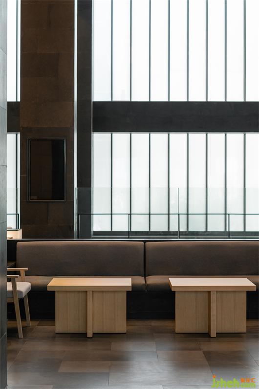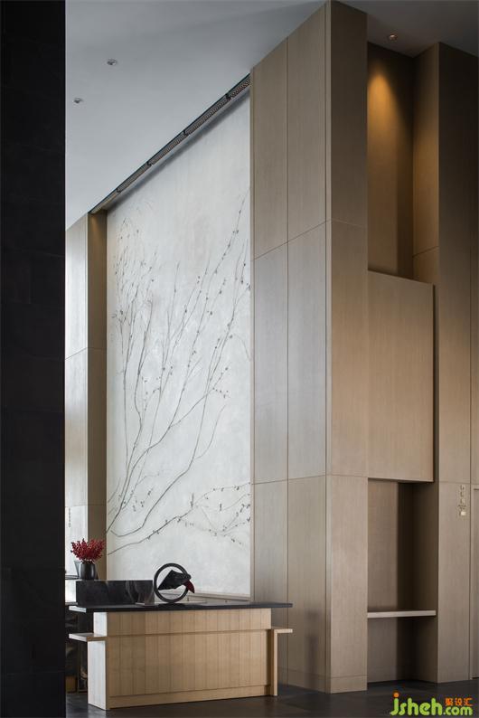 写意自然的树茎在大堂背景墙上自由生长,摒弃过度的设计,消除人与空间的距离感。木质自然、布艺亲肤,朦胧的暖光透过灯罩映衬出温馨感,如同置身家里的客厅。