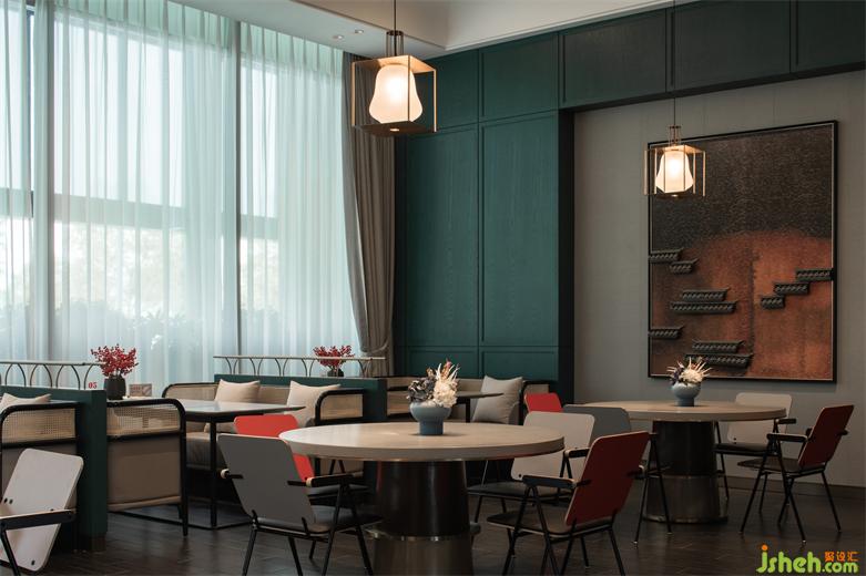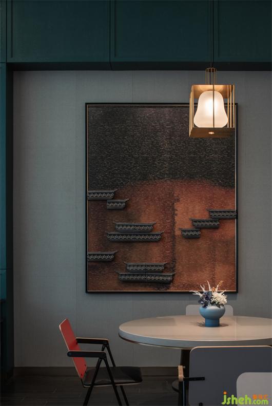 中餐厅墙面以墨绿作为点缀色,渲染出高级的复古时尚感。度假酒店设计艺术画里徽派建筑的飞檐翘角,现代中透出古意。