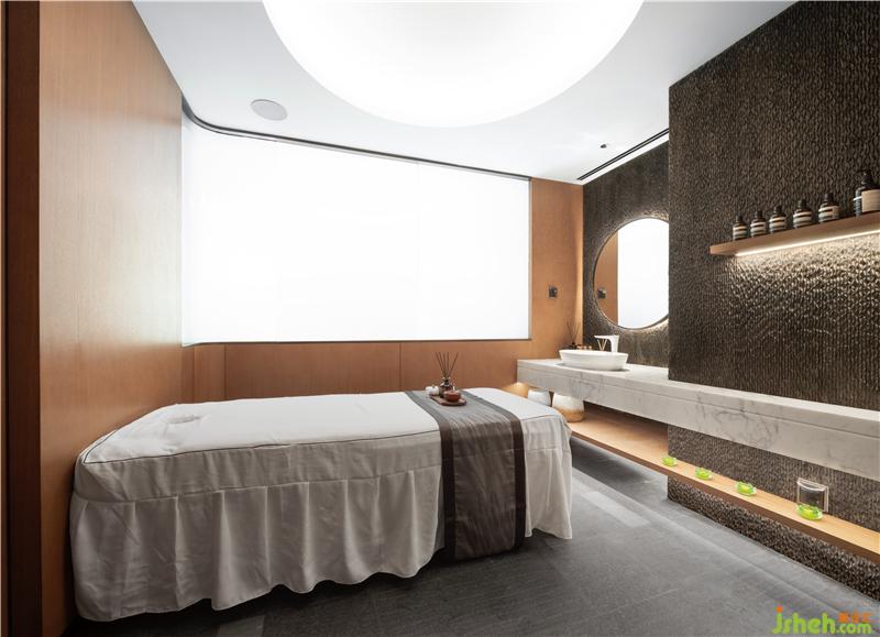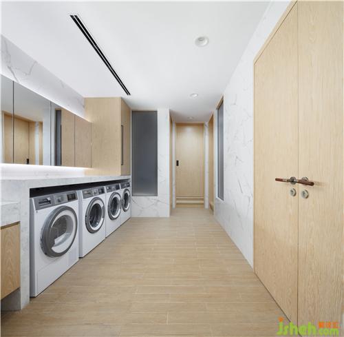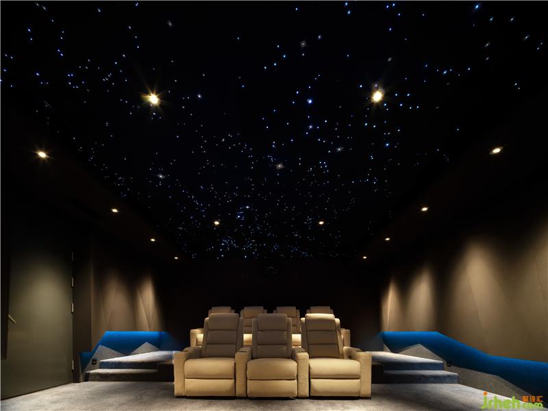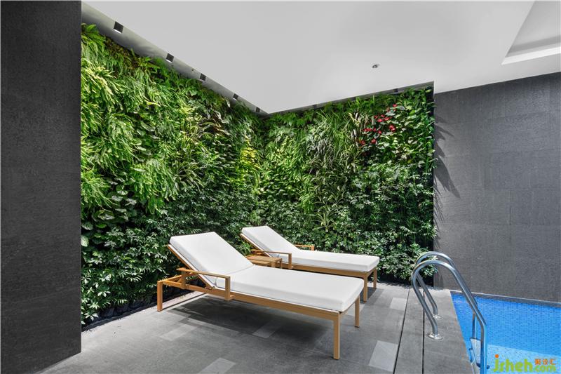 穿过两扇玻璃饰面天地轴的大门,仿佛进入了另一个空间。有一种峰回路转的感觉。整个空间刚毅硬朗,体现了主人的品味与调性。泳池蓝色的马赛克给整个空间增添了活跃的气氛。此空间的亮点是费劲周折才得以实现的五个采光天窗,把天光引入室内使空间马上多了了一份灵动,加强光线在空间中的流动,日光倾泻在清透的水面上,光影在室内多了层温柔滤镜。泳池休息区墙面满布的绿植仿佛使人与大自然有了一个亲密的接触。阳光、绿植,可见设计师的用心良苦。简明的体块感结构配合暖调的铁刀木饰面体现了空间的简洁和张力。火烧水洗面的黑色石材与毛石搭配庄重而神秘,整体材质统一且考虑到时间的流逝后历久旎新。别墅装饰
