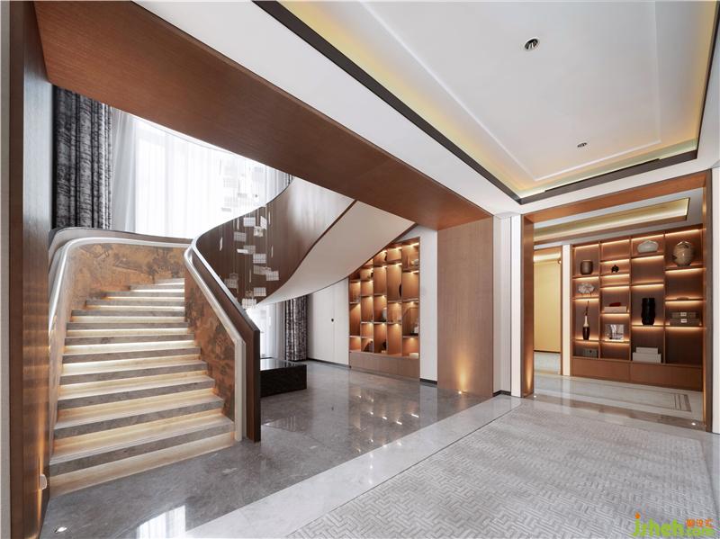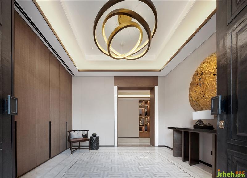 空间以中庸极致主义风格贯穿始终。转折与空间递进是一层设计的精妙所在,门厅地面的石材拼花、现代中式风格的木质格栅屏风、应用的都恰到好处,处处流入出设计师对传统文化的情有独钟。