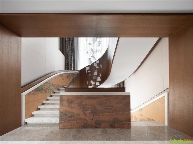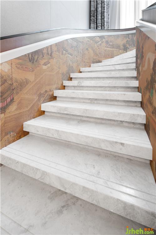 走过门厅走廊,贯穿每层空间的旋转楼梯是整个空间的中心,也是设计的一个亮点。在踏步暗藏灯带的引导下,踩在白色石材的台阶,仿佛踏上了白色祥云,扶摇而上。环顾侧面的绢丝清明上河图,宏伟的建筑,热闹的市井,人物活灵活现。北宋盛景尽收眼底。仿佛叙说着一段历史延绵不断。