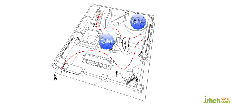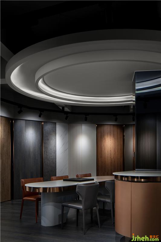 围绕选材间为回形的中心,空间顺时针将功能区域分为各类实例场景,通过动线的推敲,合理地分布并彼此交错相融。经由视觉的元素与空间语汇连接,潜移默化地促成人们在其中的行为,增强空间故事线索的串联