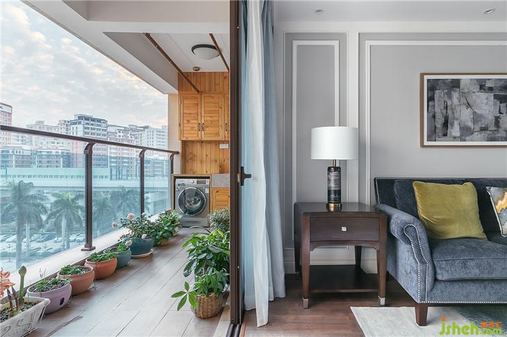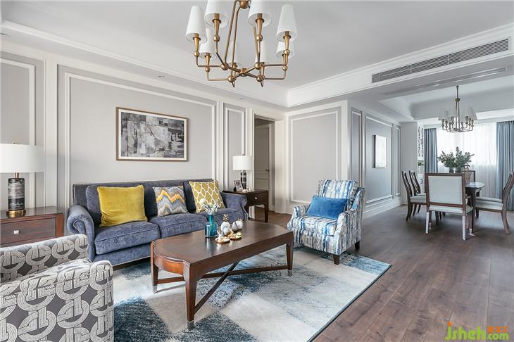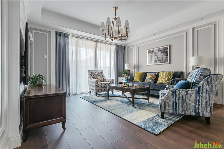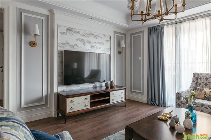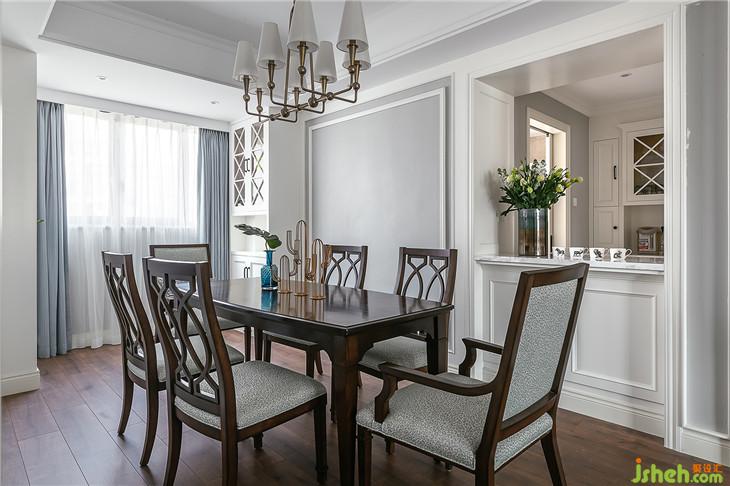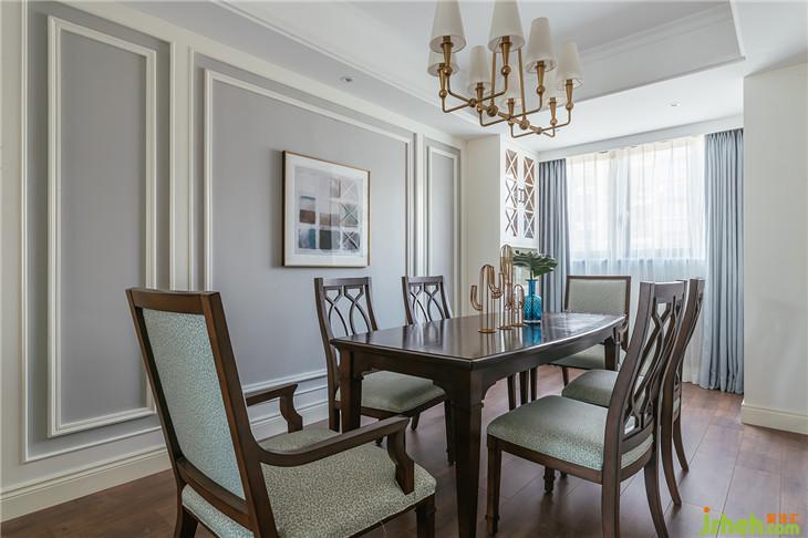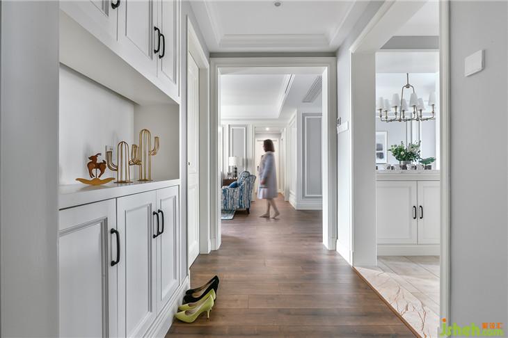设计定位为现代美式风格,整体设计遵循简洁、硬朗、淡雅、沉稳兼跳跃、活泼的主基调,采取中灰度弱对比的搭配,选材都强调突出亚光质感和原木品质。平面布局略做调整,创造出一开门即大开间的通透视野,满足了入户左边的内嵌鞋柜。把厨房小阳台包进中厨加长操作台,进而解放了入户右边区域,增加了水吧区和陈列柜,满足了日常最频繁的烧水喝水以及储放杯子茶叶。餐厅区域增加了两边陈列柜,也是为存放食材而准备。取消一间卧室,将其与主卧连通形成主卧套内衣帽间。全房地面均为进口品牌强化复合地板,客厅墙面为木饰面结合PU线条饰白漆搭配进口品牌有色乳胶漆,其它房间墙面均为进口品牌有色乳胶漆,搭配不同颜色的木器漆的实木柜体或原木家具。任何装饰都不让生活加重,所有设计都能给生活减负,一切所见都是如此日常又平常,不多也不少。