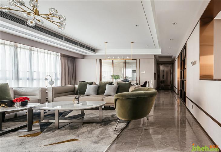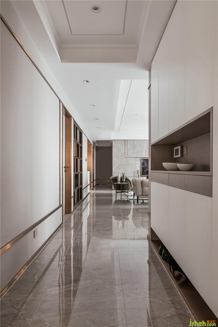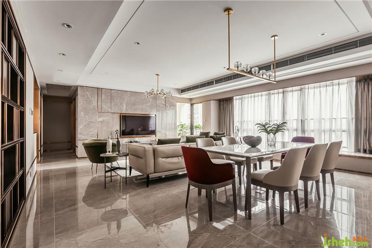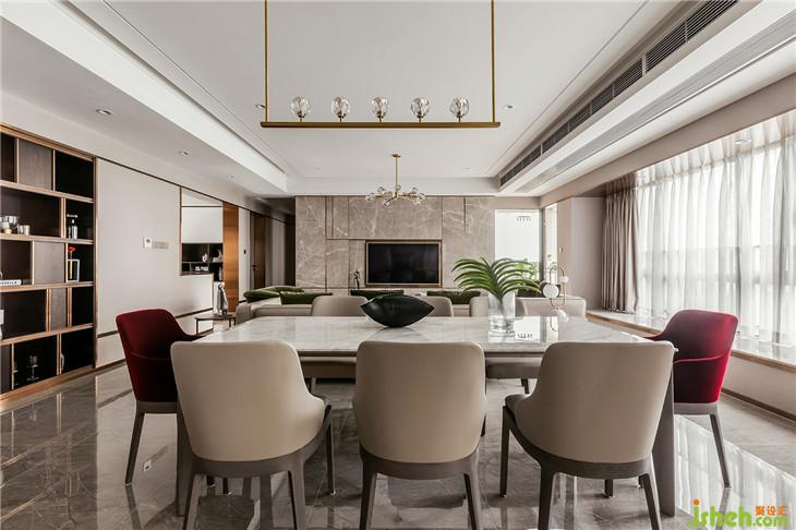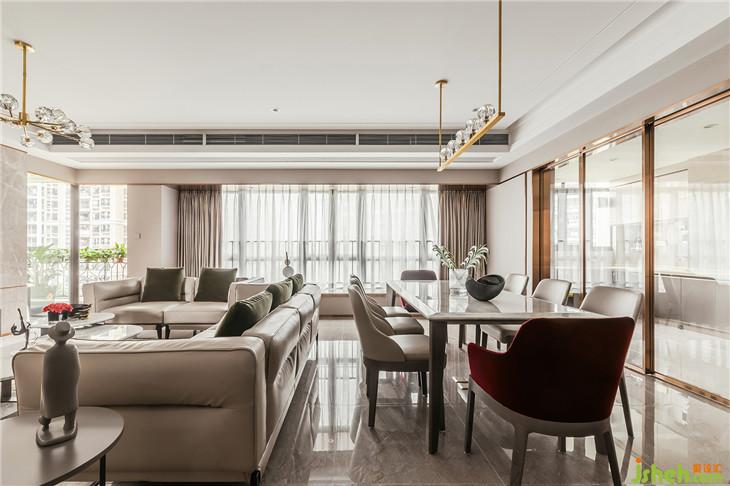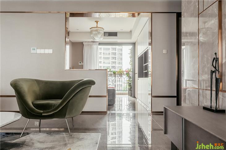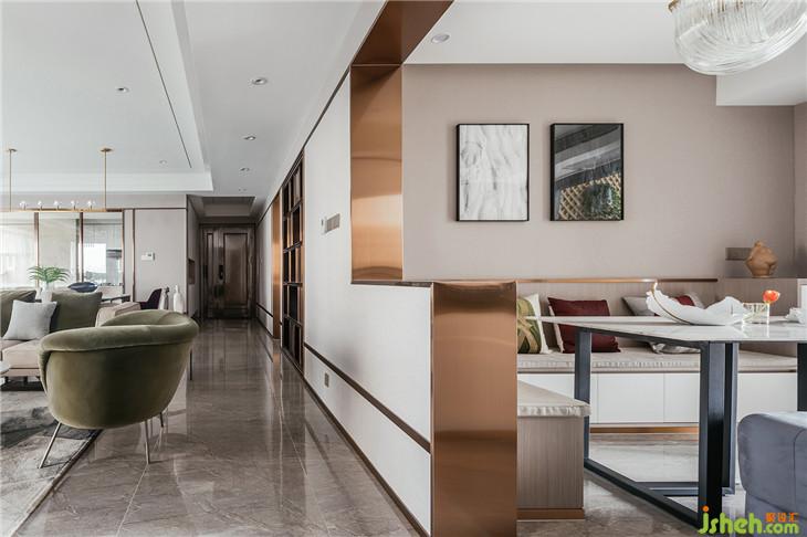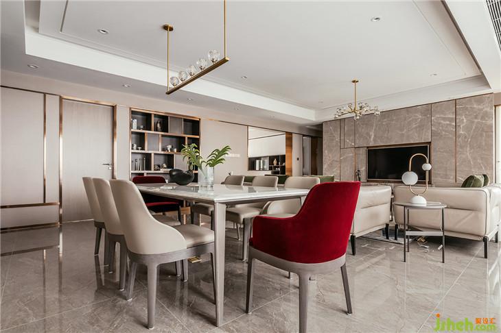 原始户型优点和缺点同样明显,客厅餐厅不分区视野大,四面开窗开门采光好,但每面墙都不对称且不完整。硬装设计以电视墙与吊顶为中心建立中轴对称关系,以金属装饰线条建立延伸围合关系,取消小阳台扩大厨房空间,全房仅保留两个卧室套间和一个客房兼储物室。围绕男主人的喜好和女主人的需求,空间设计紧扣现代简约+雅奢时尚的调性进行多向发挥,整体搭配以米金咖作为主基调,背景色基本为米咖色,陈设主色较之更深浊一层,配色加入不同色相的红与绿,点缀黑白灰平衡视觉。