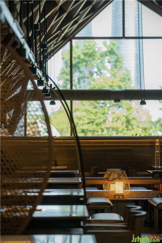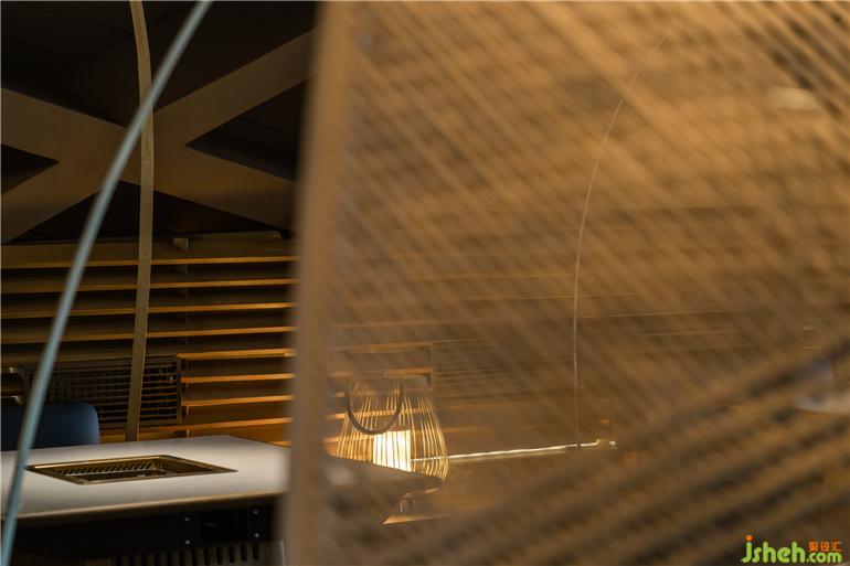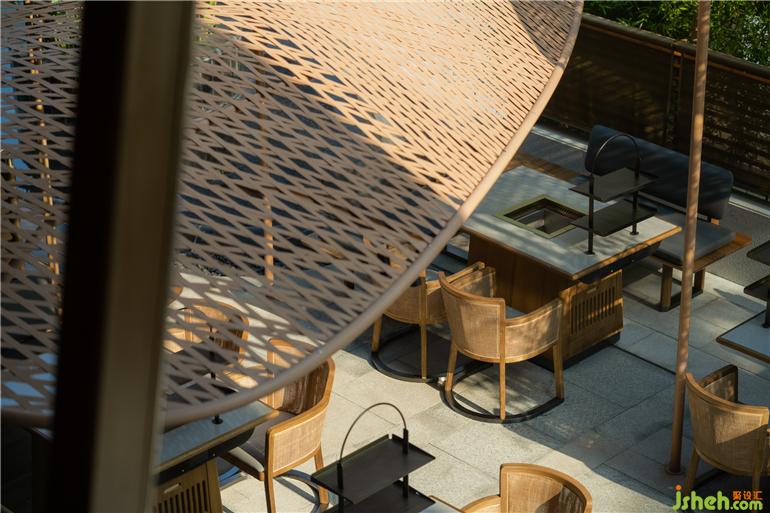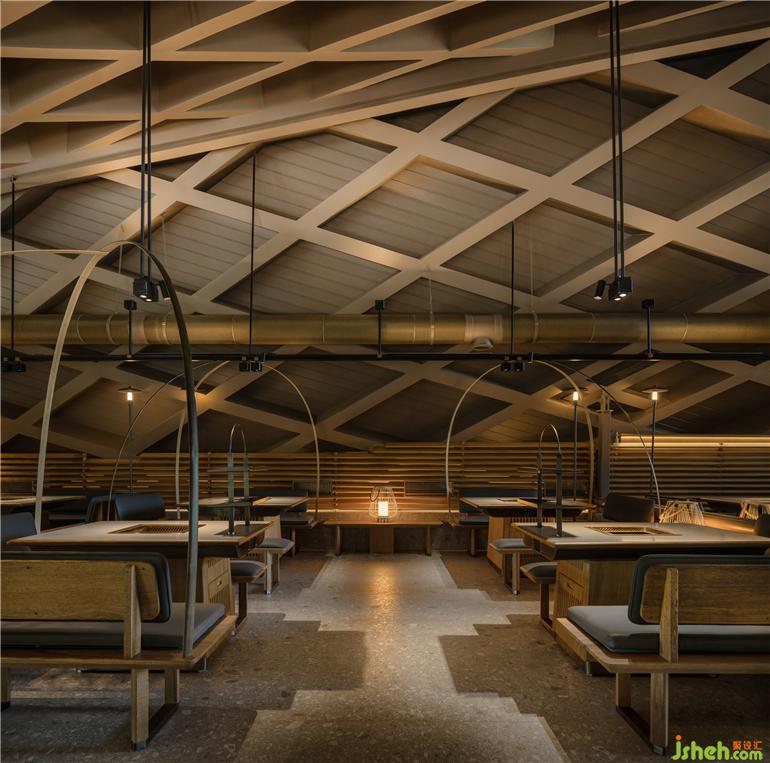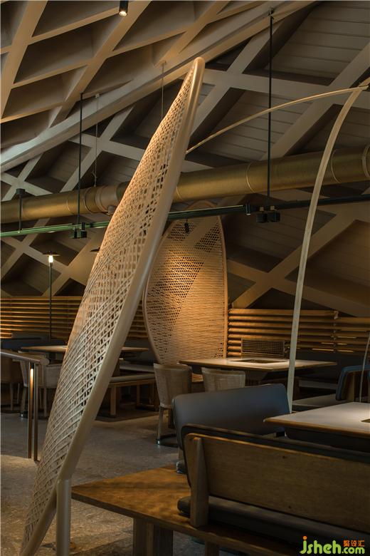 原有建筑中,火锅店设计留下了曲线勾勒的柔软斜顶,也因此有了塑造田园、人家的设计构想。竹编的劳作工具是川西人们最亲密的助手,我们将之重新定义,组合成风雨蓬,隔间屏风等多样的主题构件,也由此展开了所有空间印象的设计延伸。