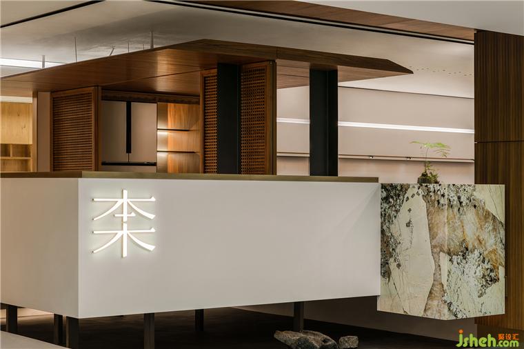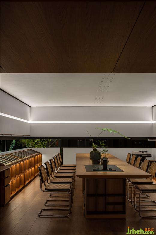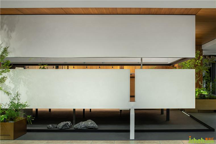 在这里,展厅设计师恰如其分地引入室内园林的元素,点缀的顽石在架空层边缘,与植物枝影成为界定空间边缘的元素,生气怡然。横贯盒子中上部的长窗的高度被设计师精心设计,成为视线遮蔽与开启的重点。这样,接待与方案讨论被共享和自然分区,互为可交流的风景。