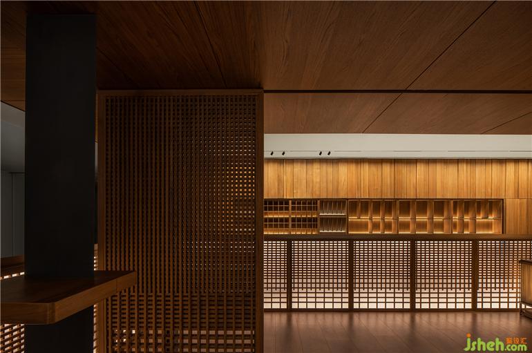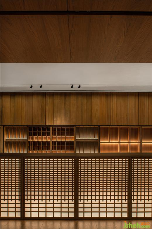 展厅设计师在空间的视觉处理非常精妙,他们用木质网用形成精致的木栅幛子和节奏段落,控制住视线的模糊性和深远度,让视线在空间中时而穿透、时而聚焦,这一切都在不经意间使人关注“本木”对产品的尽心,作为空间设计师,蜂鸟设计在设计时充分注重氛围的营造,总体上在变换中体现出整体性和单纯性。